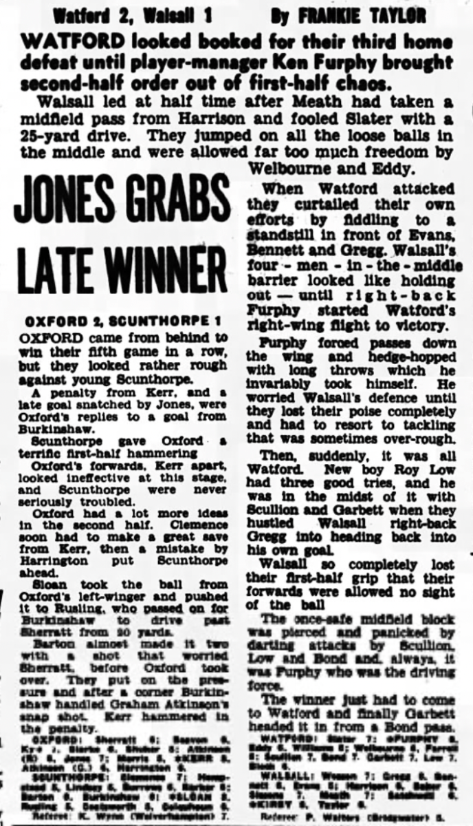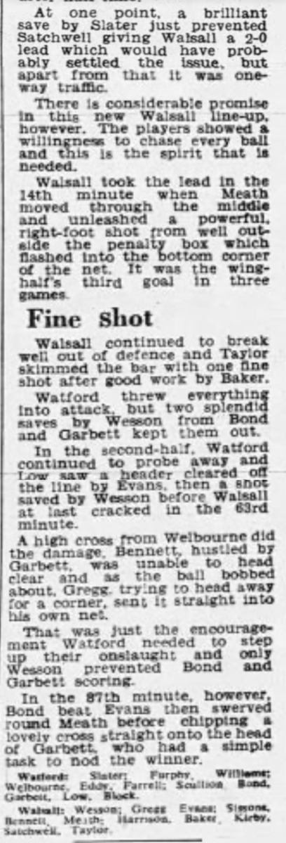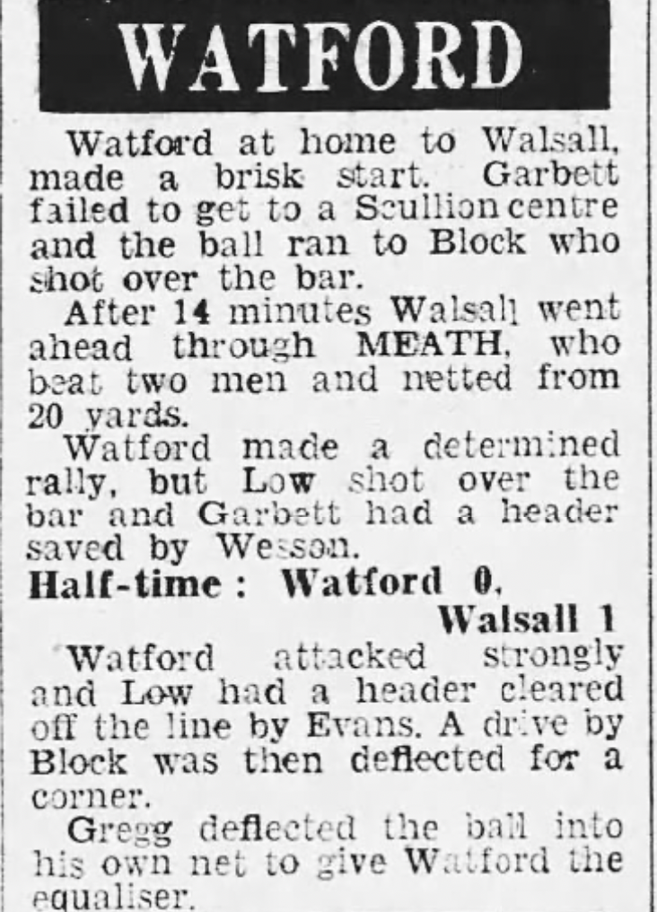 18th February 1967- Division Three, Watford 2 Walsall 1 Leave a Reply http://watford.fcdb.info/index.php?page=matches Evening Standard, 18 Feb 2967 Birmingham Sunday Mercury, 19 Feb 2967 Sunday Mirror, 19 Feb 1967 Sunday People, 19 Feb 1967 Watford Observer match report Share this: Share on X (Opens in new window) X Share on Facebook (Opens in new window) Facebook