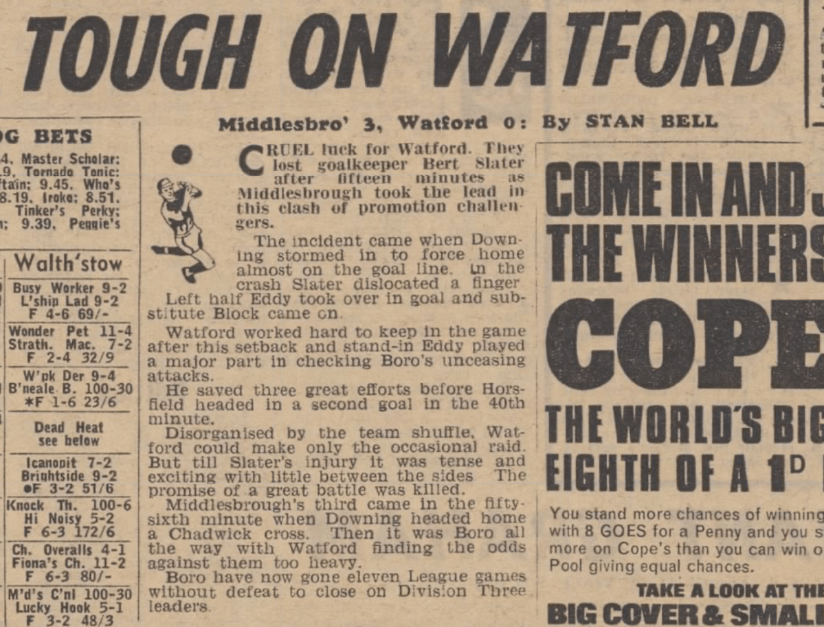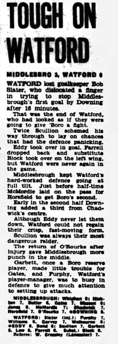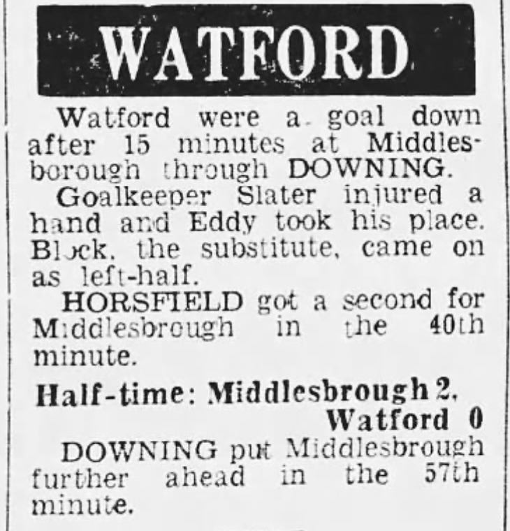 25th February 1967- Division Three, Middlesbrough 3 Watford 0 Leave a Reply http://watford.fcdb.info?id=2662 Evening Standard, 25 Feb 1967 Sunday Mirror, 26 Feb 1967 Sunday People, 26 Feb 1967 Watford Observer match report https://www.soccerbase.com/matches/results.sd?date=1967-02-25 https://www.11v11.com/league-tables/league-division-three/25-february-1967/ Share this: Share on X (Opens in new window) X Share on Facebook (Opens in new window) Facebook