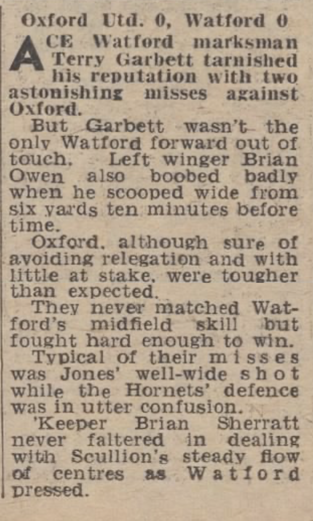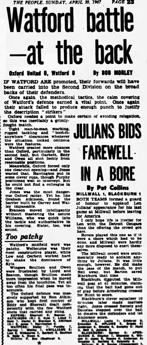 29th April 1967- Division Three, Oxford United 0 Watford 0 Leave a Reply http://watford.fcdb.info?id=2675 Evening Standard, 29 Apr 1967 Sunday Mirror, 30 Apr 1967 Sunday People, 30 Apr 1967 Watford Observer match report Share this: Share on X (Opens in new window) X Share on Facebook (Opens in new window) Facebook