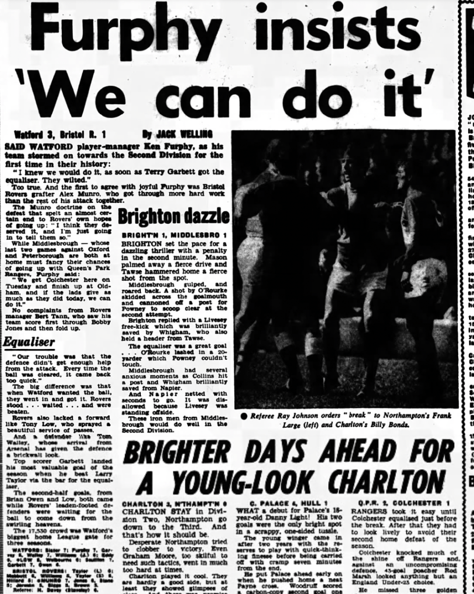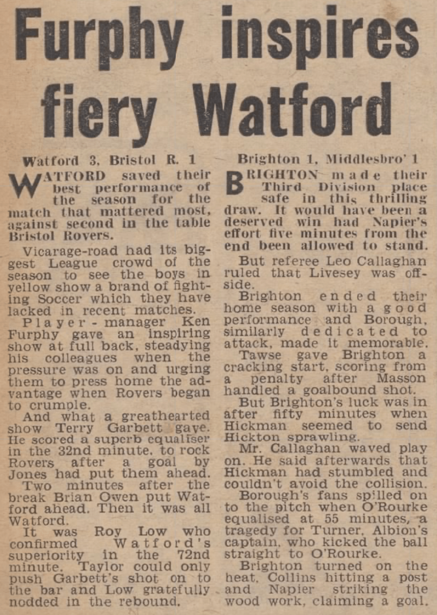 6th May 1967- Division Three, Watford 3 Bristol Rovers 1 Leave a Reply http://watford.fcdb.info?id=2676 Evening Standard, 6 May 1967 Sunday Mirror, 7 May 1967 Sunday People, 7 May 1967 Watford Observer match report Share this: Share on X (Opens in new window) X Share on Facebook (Opens in new window) Facebook