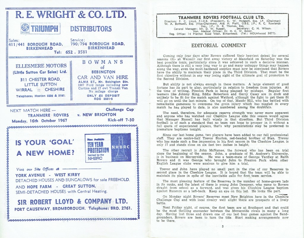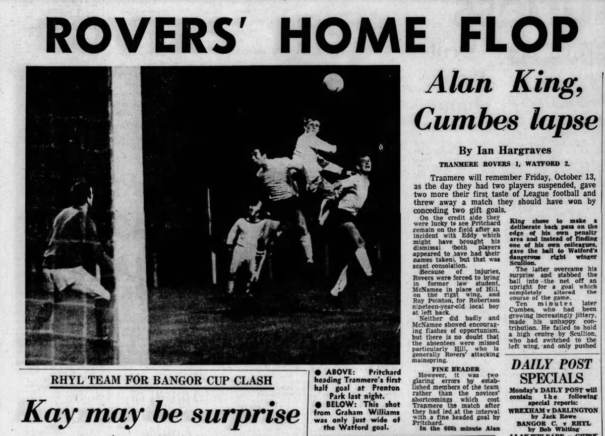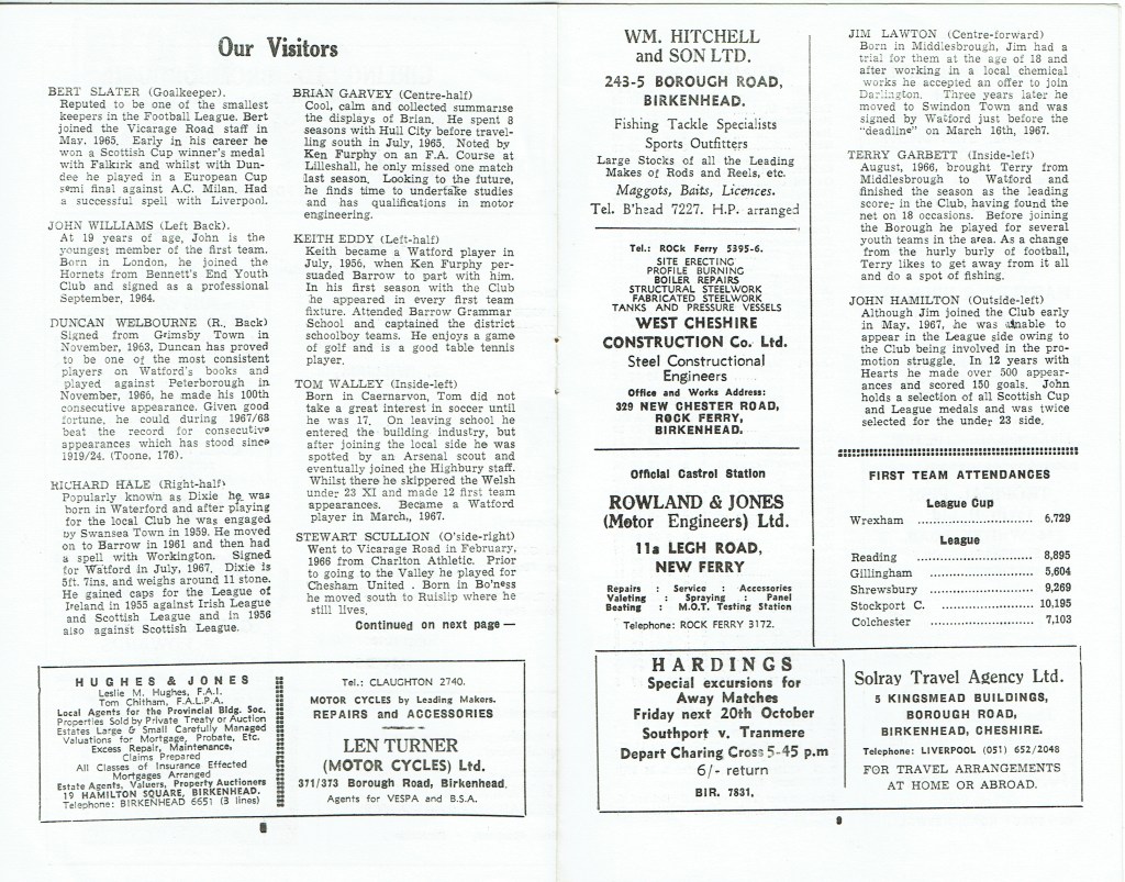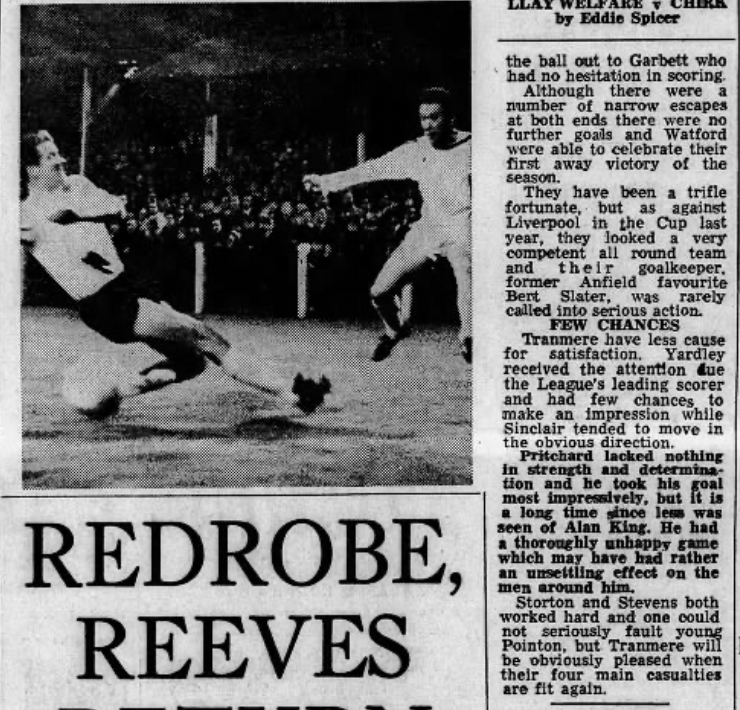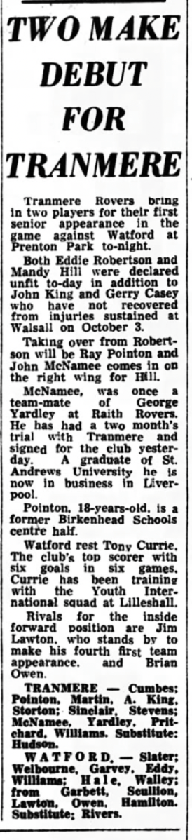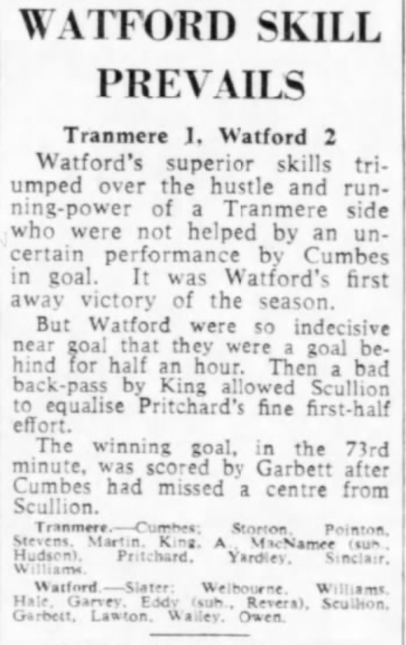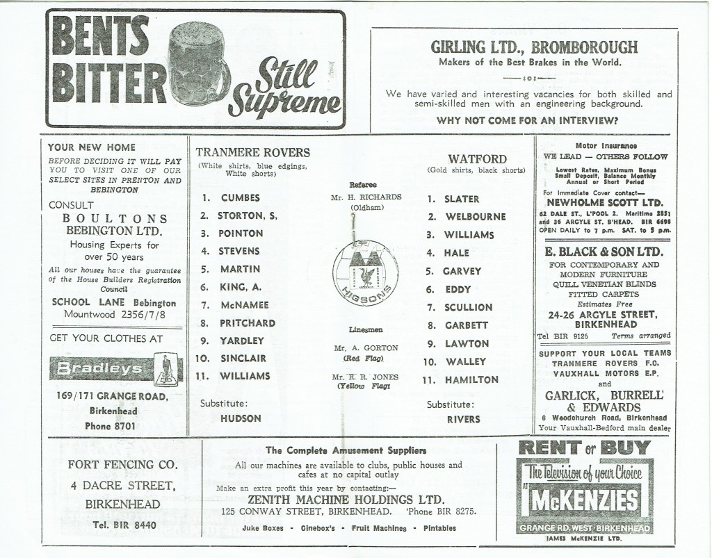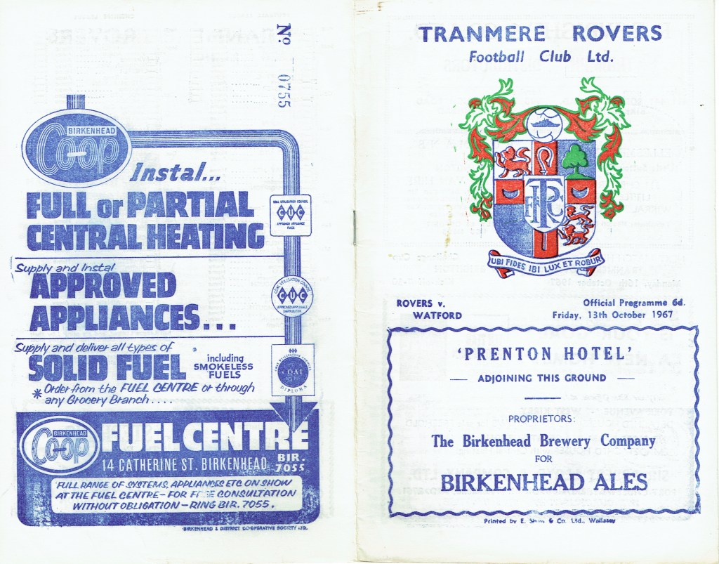 13th October 1967- Division Three, Tranmere Rovers 1 Watford 2 Leave a Reply Liverpool Echo, 13 Oct 1967 Daily Telegraph, 14 Oct 1967 Merseyside Daily Post, 14 Oct 1967 Watford Observer match report Share this: Share on X (Opens in new window) X Share on Facebook (Opens in new window) Facebook