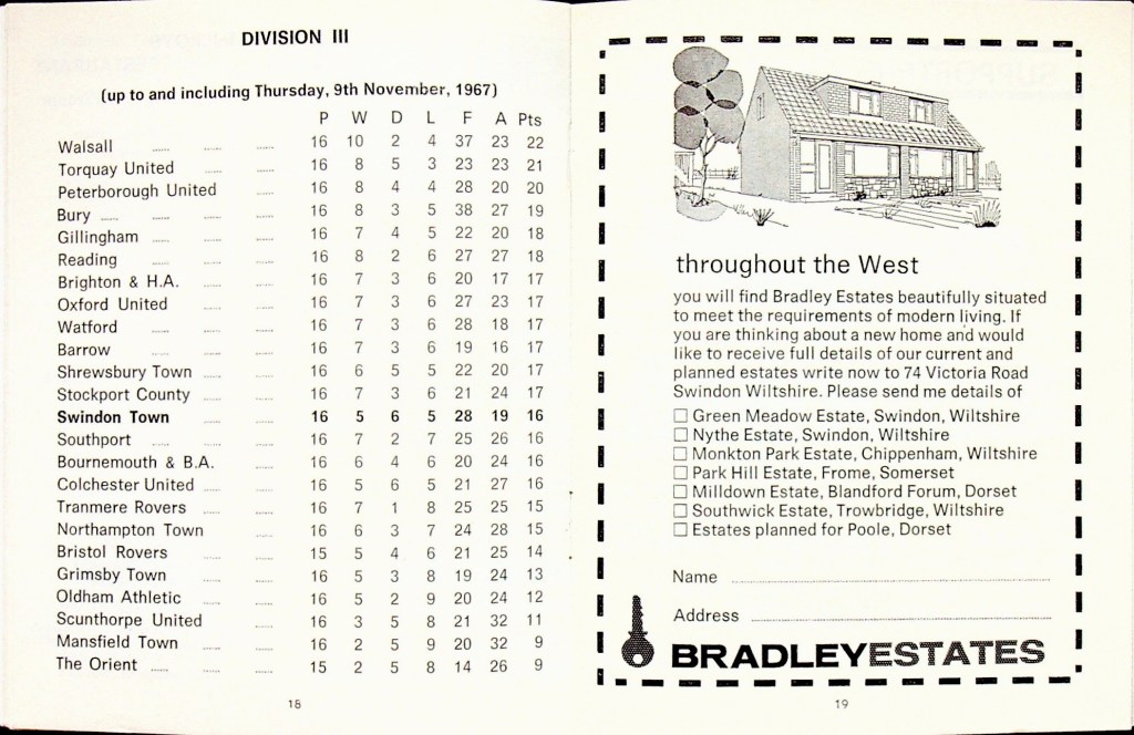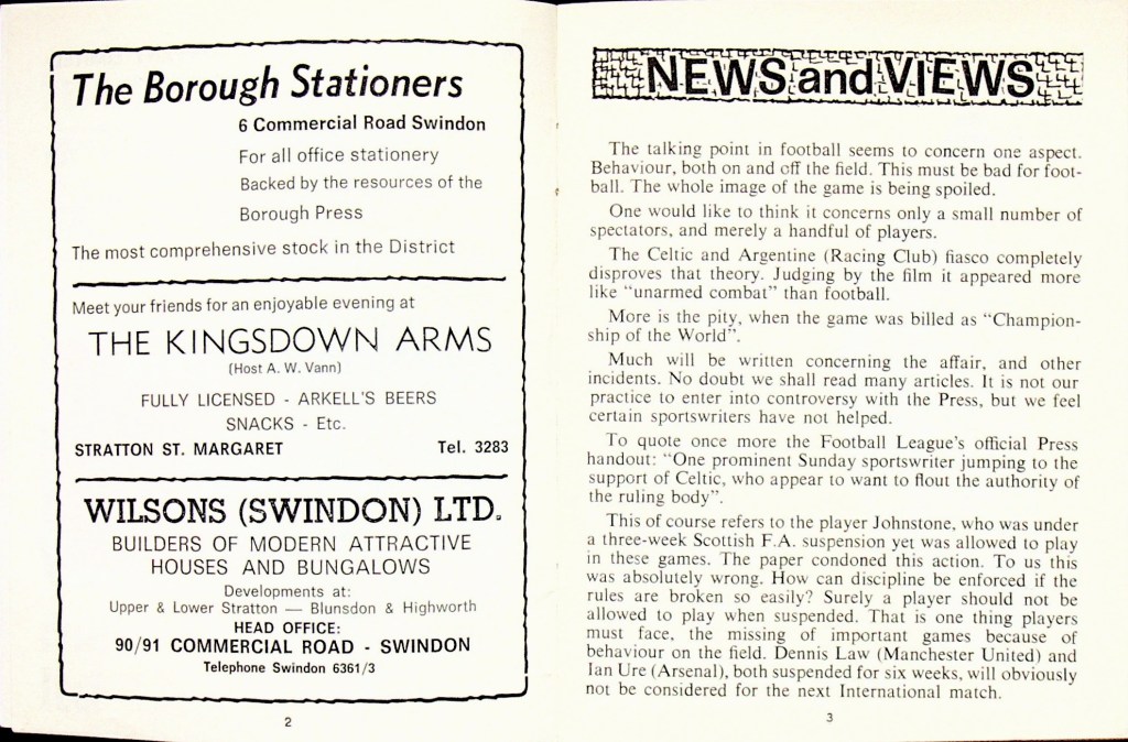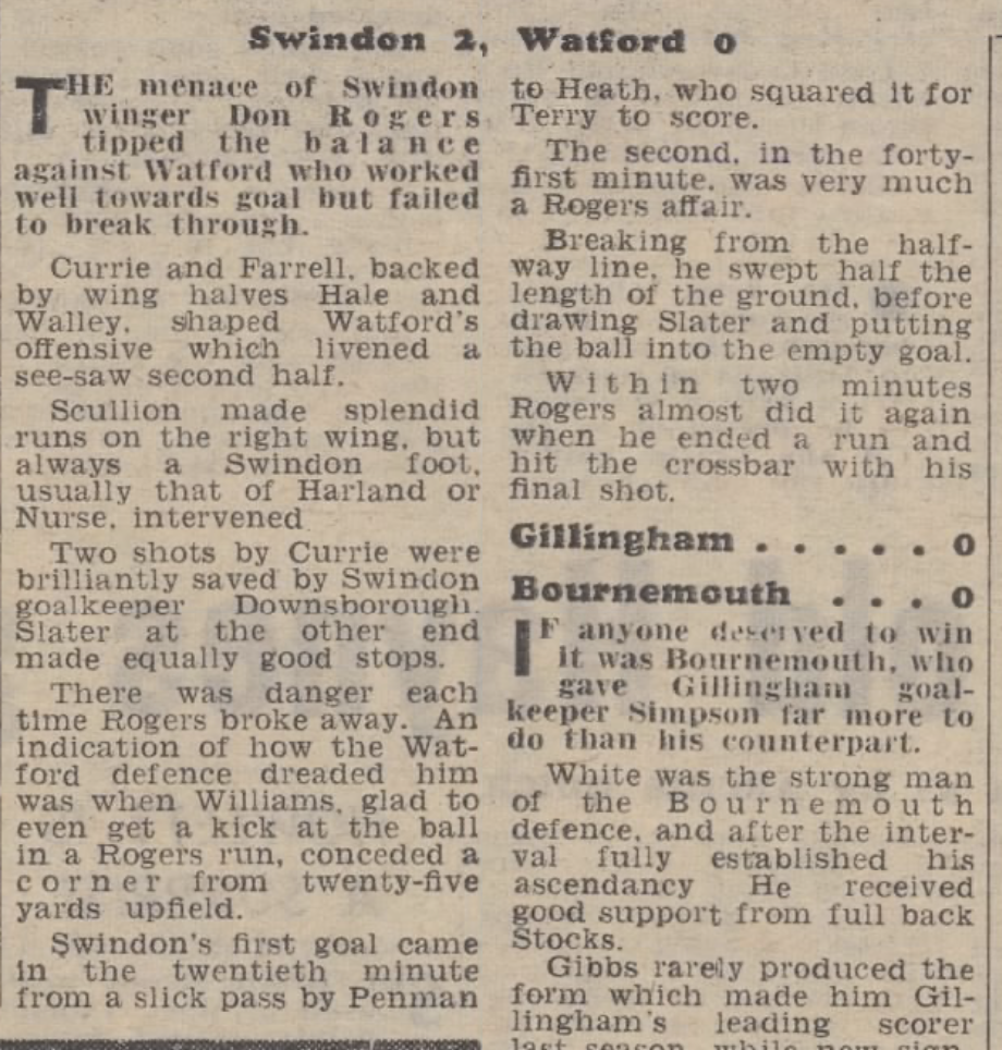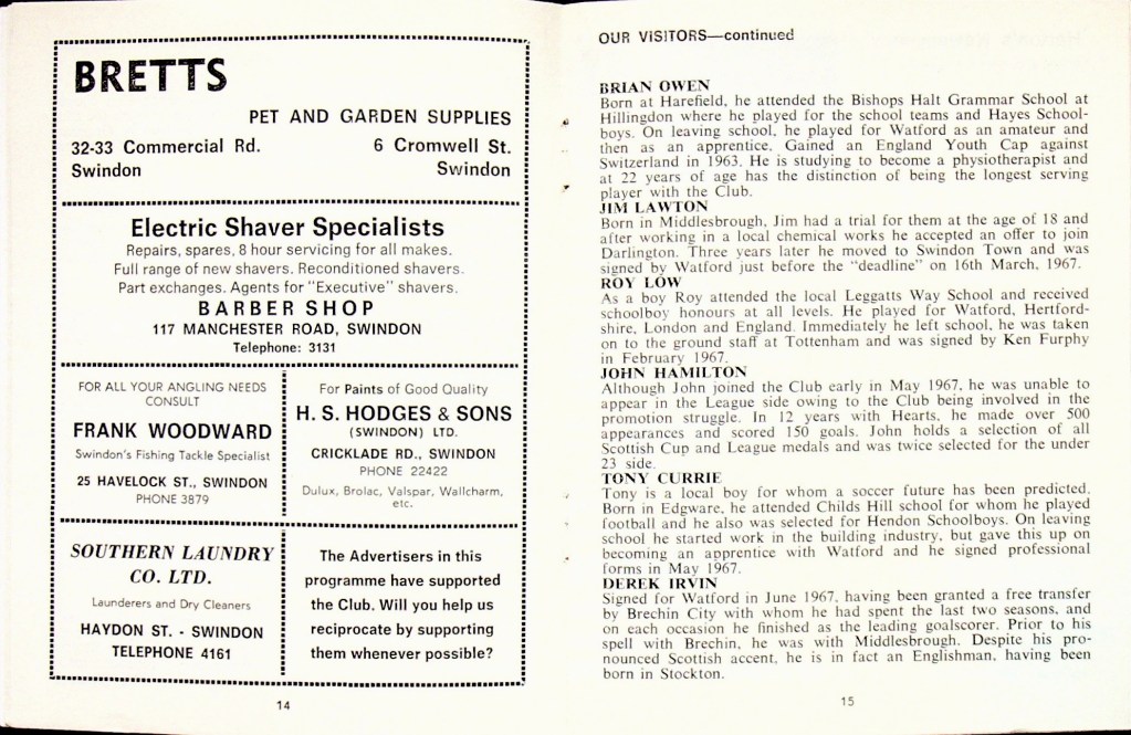 11th November 1967- Division Three, Swindon Town 2 Watford 0 Leave a Reply http://watford.fcdb.info?s=37605&id=2699 Sunday Mirror, 12 Nov 1967 Sunday People, 12 Nov 1967 Watford Observer match report Share this: Share on X (Opens in new window) X Share on Facebook (Opens in new window) Facebook