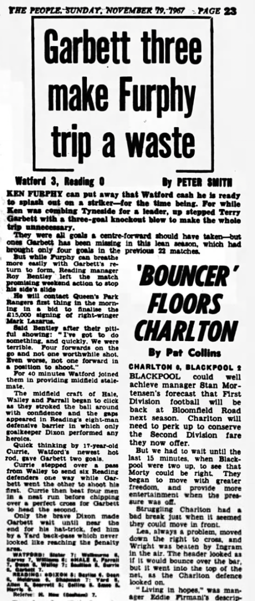 18th November 1967- Division Three, Watford 3 Reading 0 Leave a Reply http://watford.fcdb.info?s=37934&id=2701 Sunday Mirror, 19 Nov 1967 Sunday People, 19 Nov 1967 Watford Observer match report Share this: Share on X (Opens in new window) X Share on Facebook (Opens in new window) Facebook