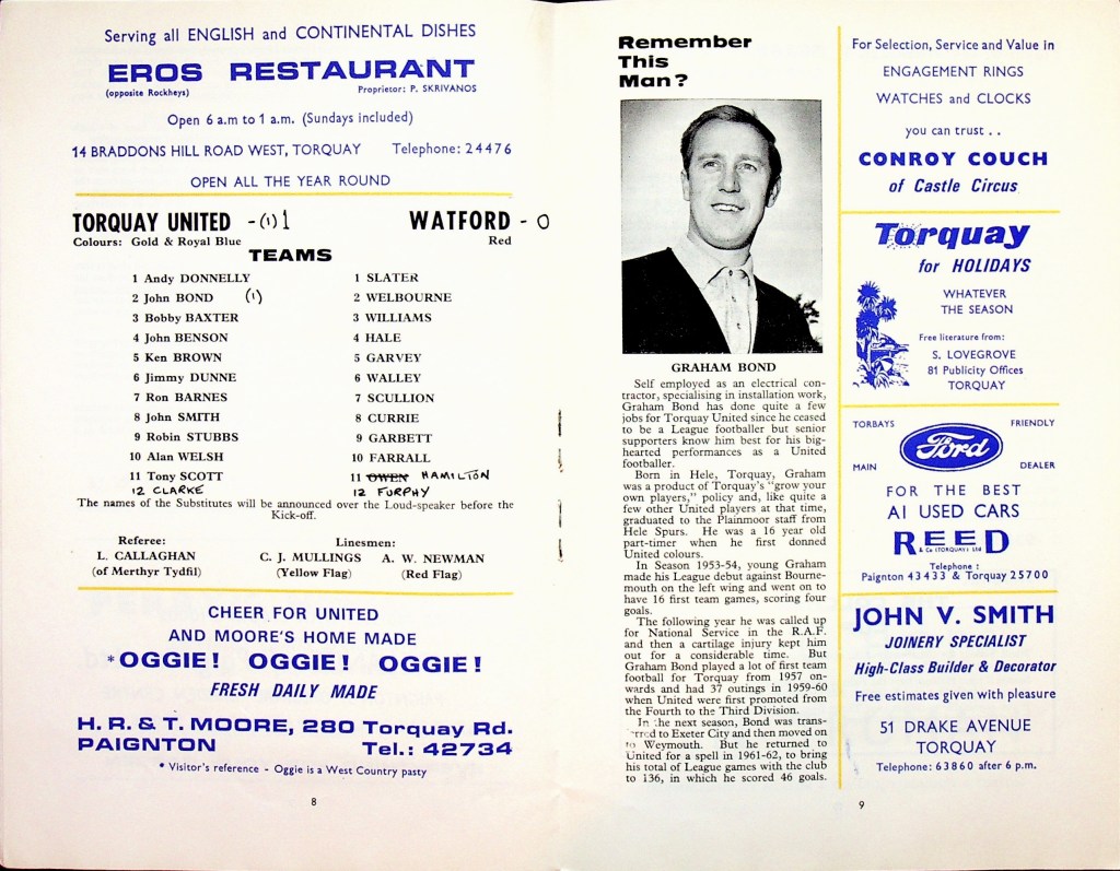 25th November 1967- Division Three, Torquay United 1 Watford 0 Leave a Reply http://watford.fcdb.info?s=39661&id=2702 Sunday People, 26 Nov 1967 Watford Observer match report Share this: Share on X (Opens in new window) X Share on Facebook (Opens in new window) Facebook