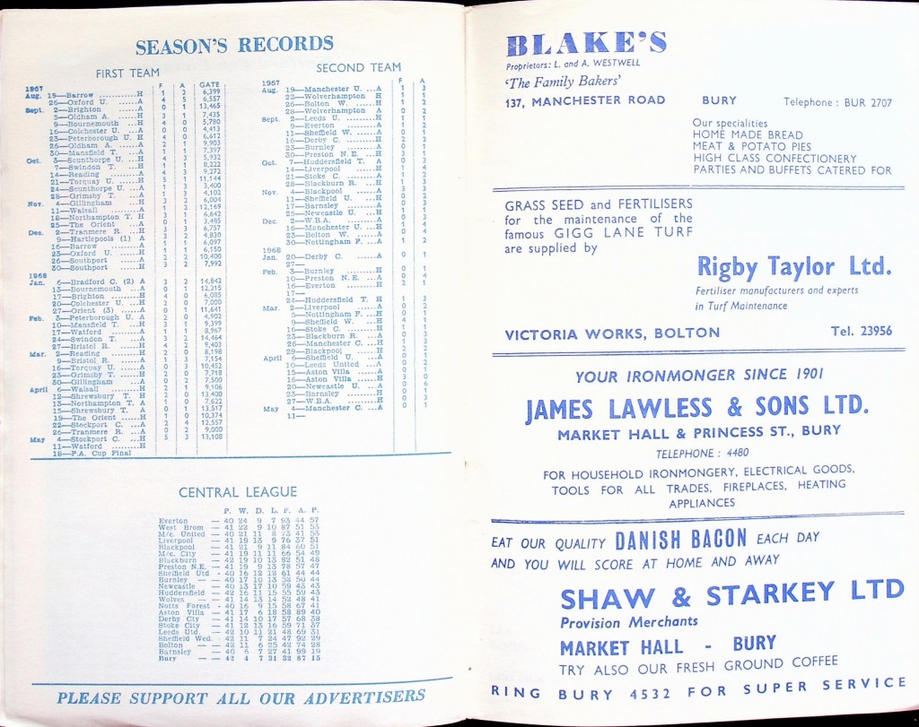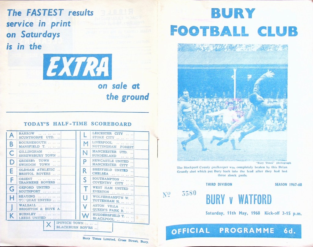 11th May 1968- Division Three, Bury 2 Watford 0 Leave a Reply http://watford.fcdb.info?id=2731 Sunday People, 12 May 1968 https://www.soccerbase.com/matches/results.sd?date=1968-05-11 https://www.11v11.com/league-tables/league-division-three/11-may-1968/ Share this: Share on X (Opens in new window) X Share on Facebook (Opens in new window) Facebook