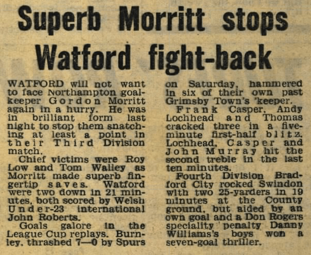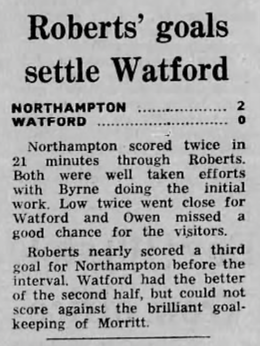10th September 1968- Division Three, Northampton Town 2 Watford 0 Leave a Reply http://watford.fcdb.info?id=2738 Daily Mirror, 11 Sep 1968 Daily Telegraph, 11 Sep 1968 Guardian Journal, 11 Sep 1968 Share this: Share on X (Opens in new window) X Share on Facebook (Opens in new window) Facebook