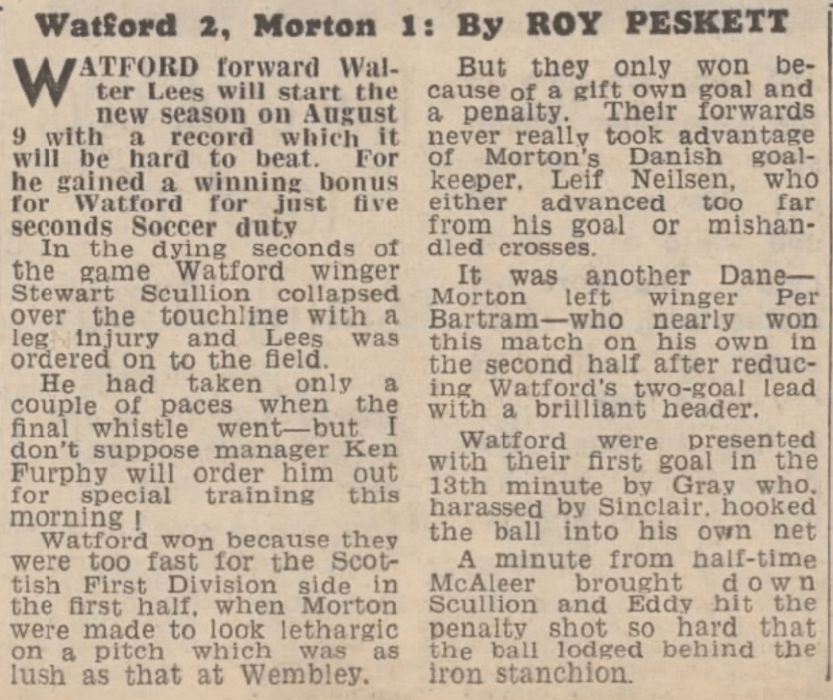 26th July 1969- Friendly, Watford 2 Greenock Morton 1 Leave a Reply Sunday Mirror, 27 Jul 1969 Watford Observer match report Share this: Click to share on X (Opens in new window) X Click to share on Facebook (Opens in new window) Facebook
