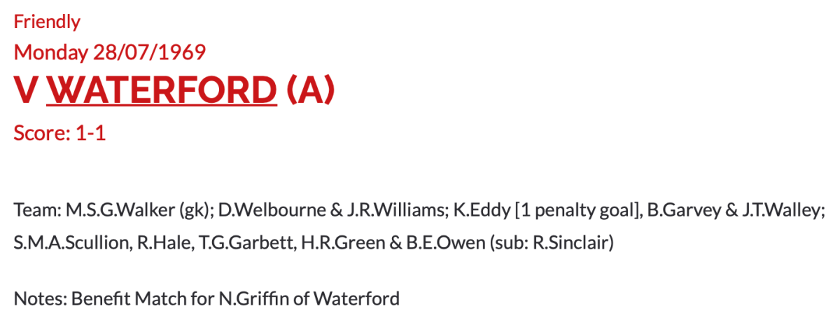 28 July 1969- Friendly, Waterford 1 Watford 1 https://www.watfordfcarchive.co.uk/fixture/1969-07-28 Watford Observer match report Share this: Click to share on X (Opens in new window) X Click to share on Facebook (Opens in new window) Facebook