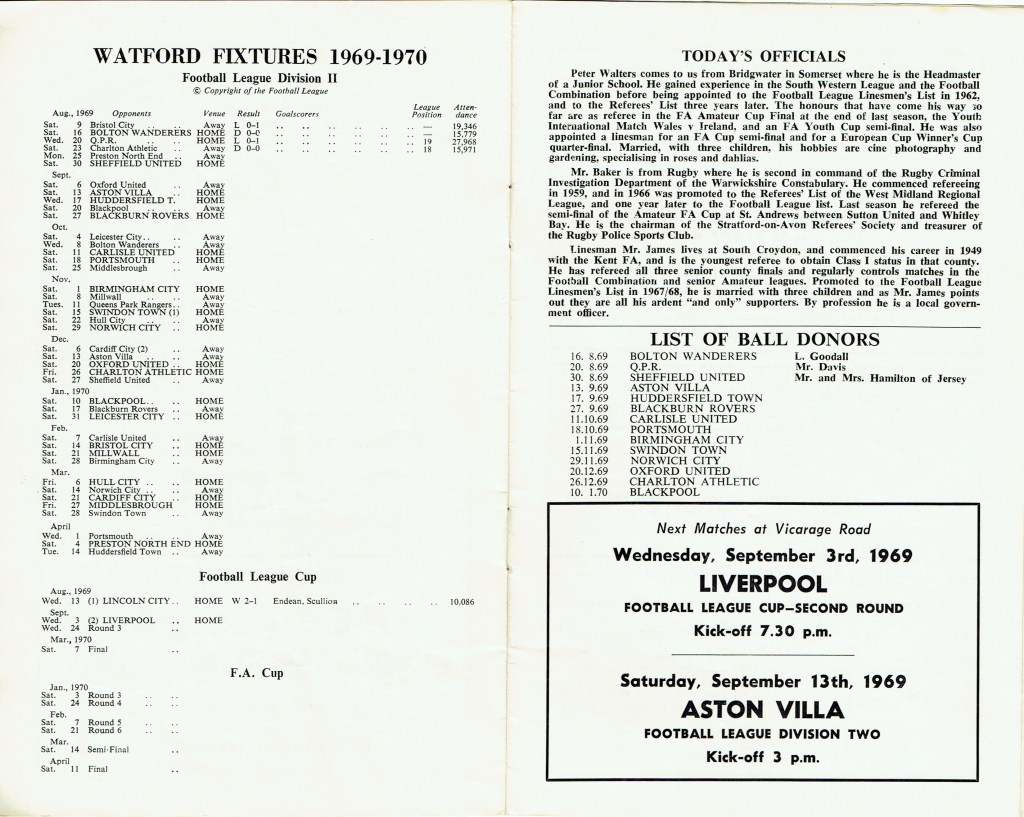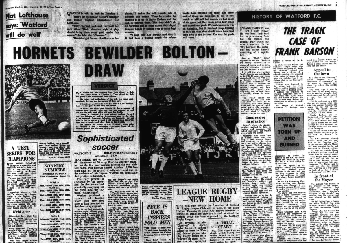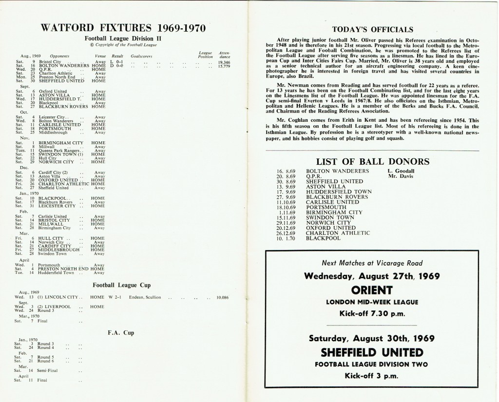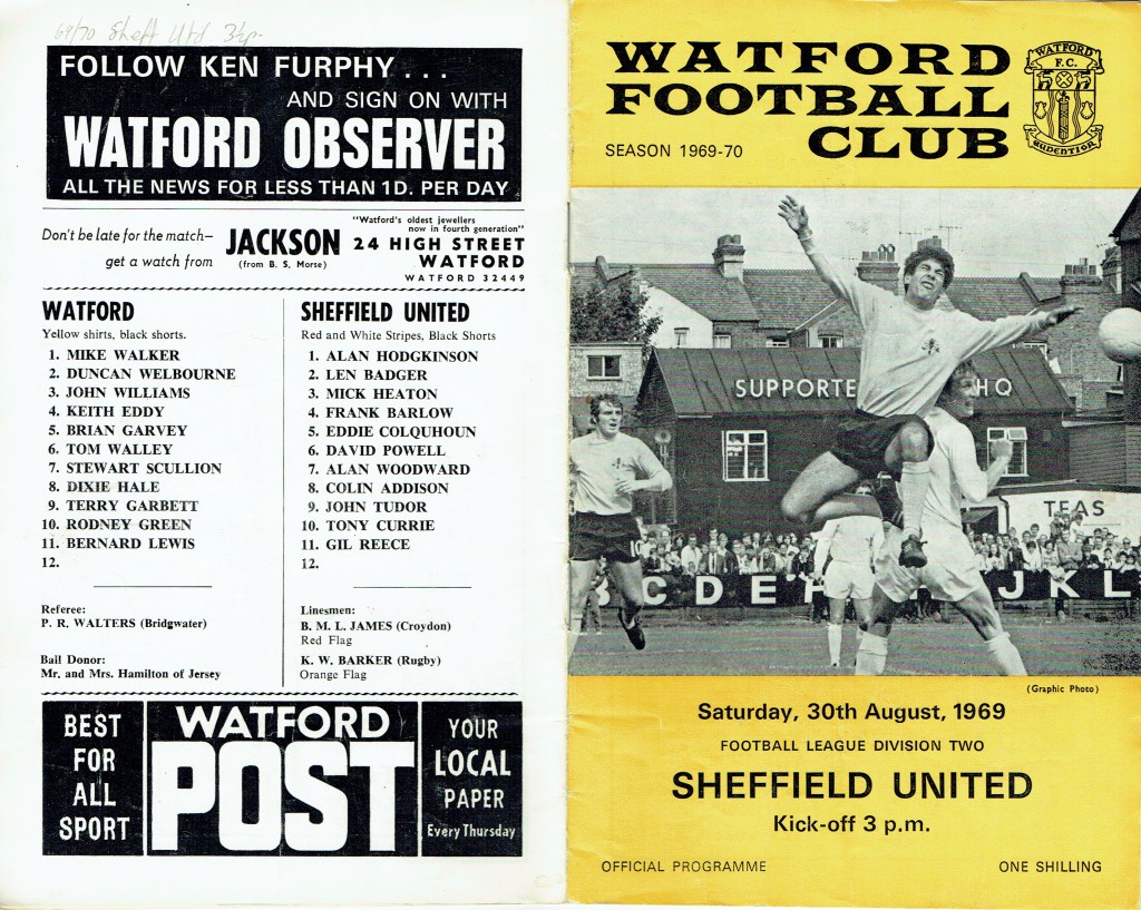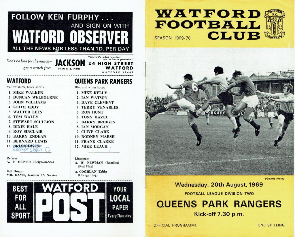 http://watford.fcdb.info?id=2790Evening Standard, 30 Aug 1969Sunday Mirror, 31 Aug 1969- Not sure what happened to the last line of the report!The Observer, 31 Aug 1969