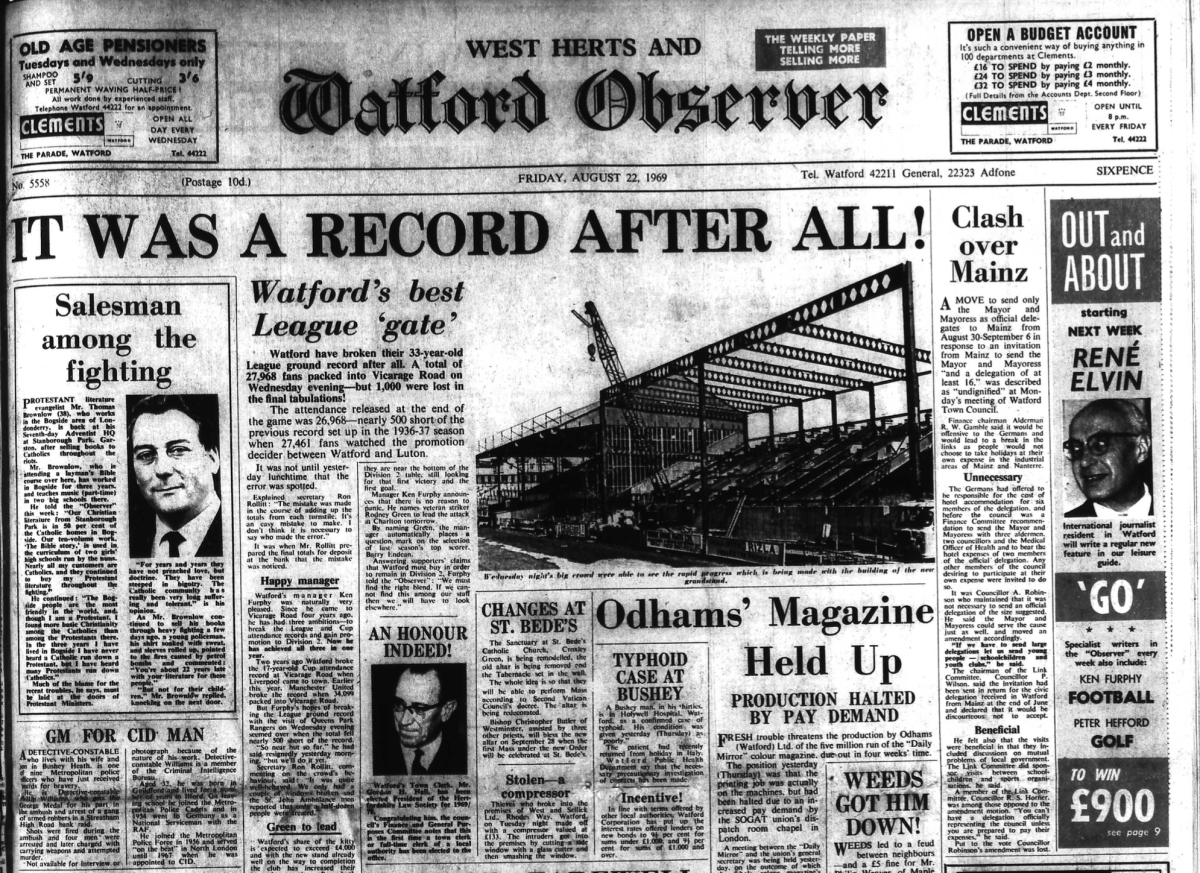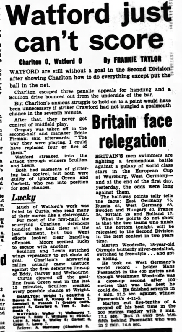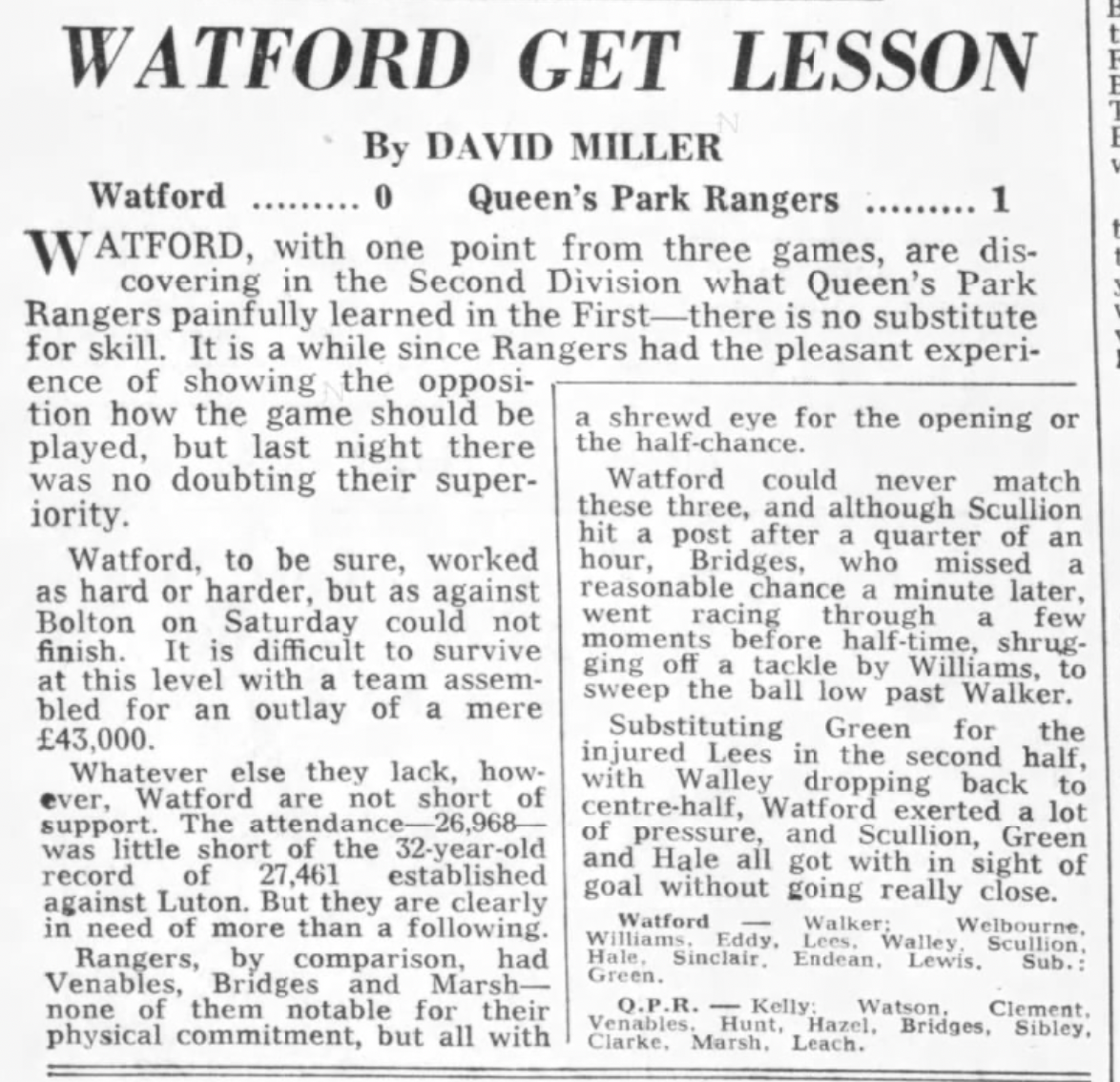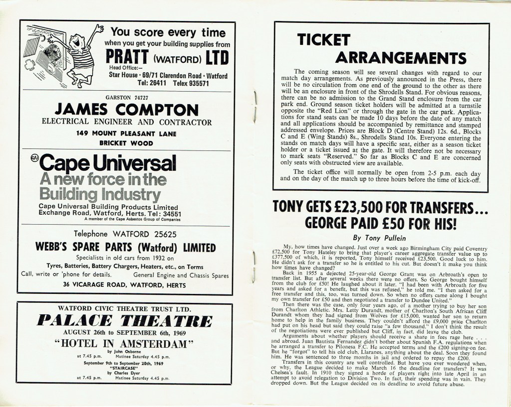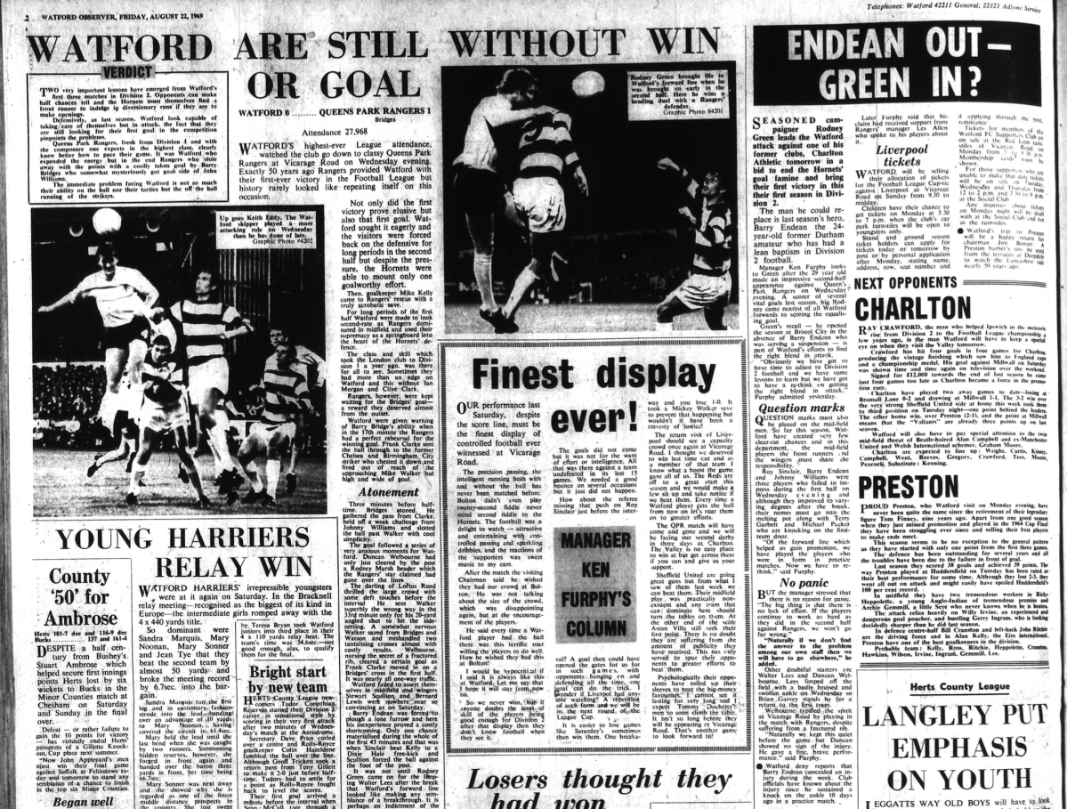 http://watford.fcdb.info?id=2790Evening Standard, 30 Aug 1969Sunday Mirror, 31 Aug 1969- Not sure what happened to the last line of the report!The Observer, 31 Aug 1969