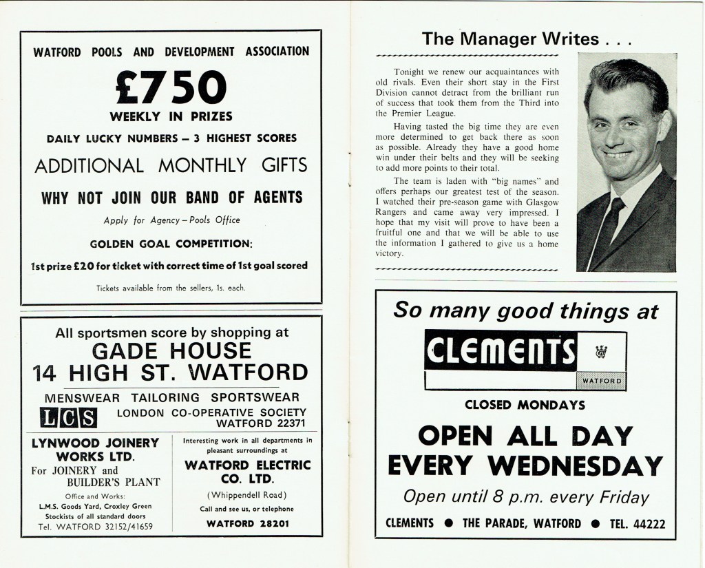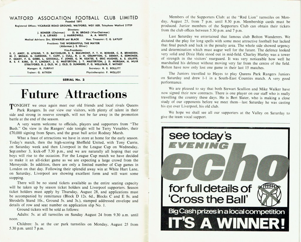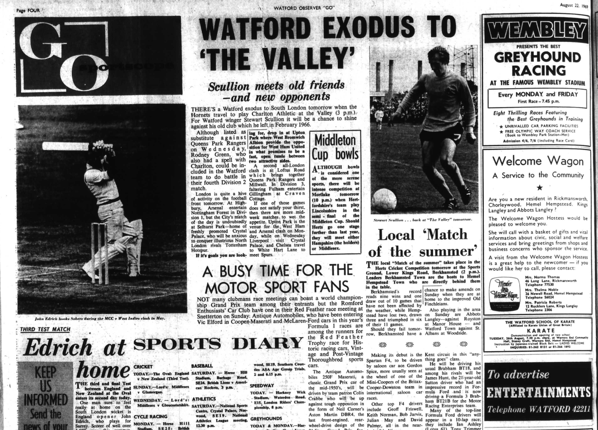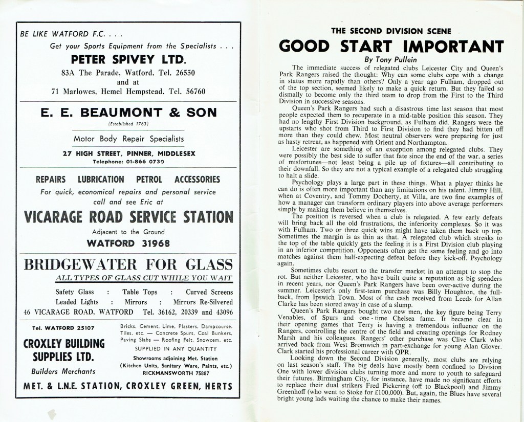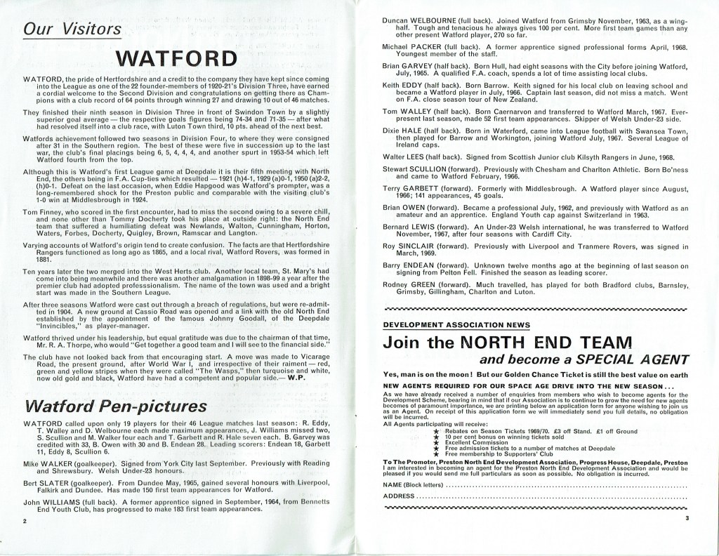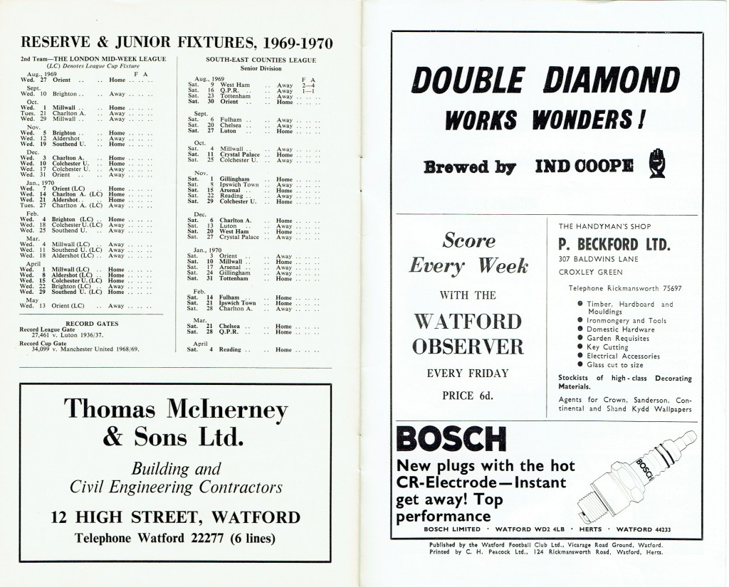 http://watford.fcdb.info?id=2790Evening Standard, 30 Aug 1969Sunday Mirror, 31 Aug 1969- Not sure what happened to the last line of the report!The Observer, 31 Aug 1969