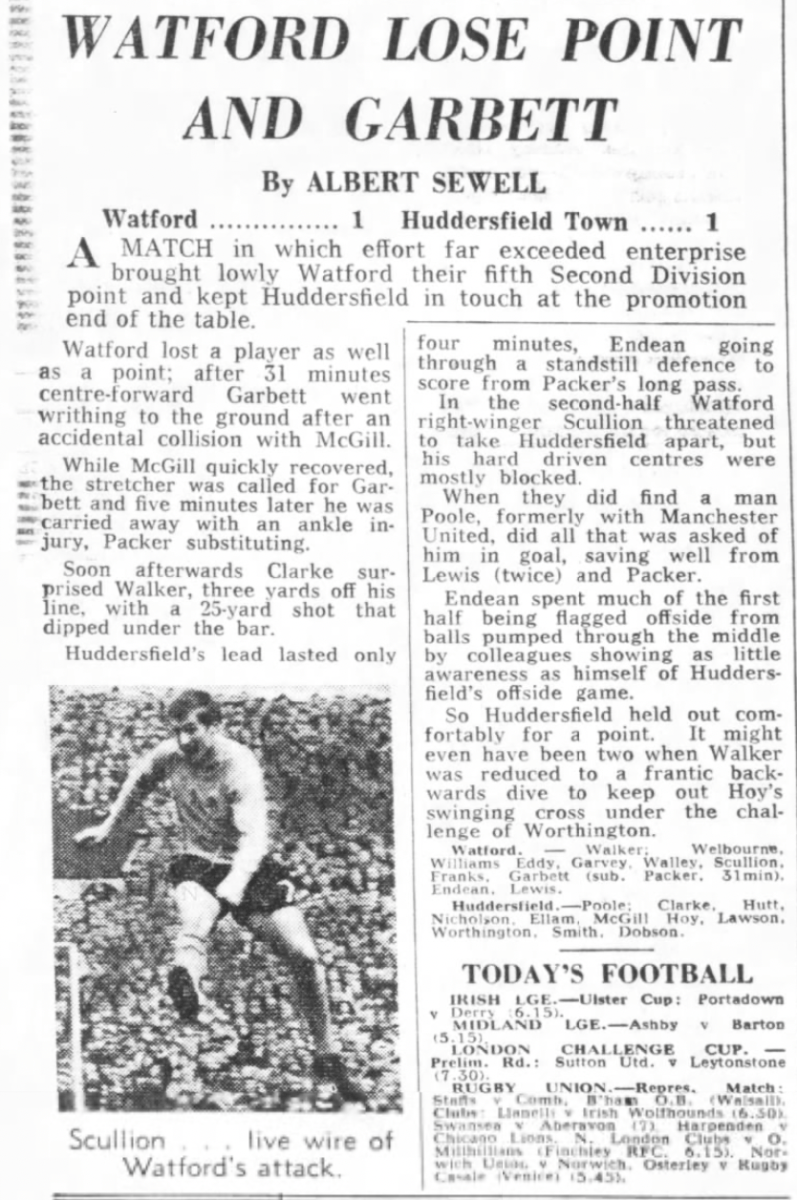 17th September 1969-Division Two, Watford 1 Huddersfield Town 1 Leave a Reply http://watford.fcdb.info?id=2794 Daily Telegraph, 18 Sep 1969 Watford Observer match report Share this: Share on X (Opens in new window) X Share on Facebook (Opens in new window) Facebook
