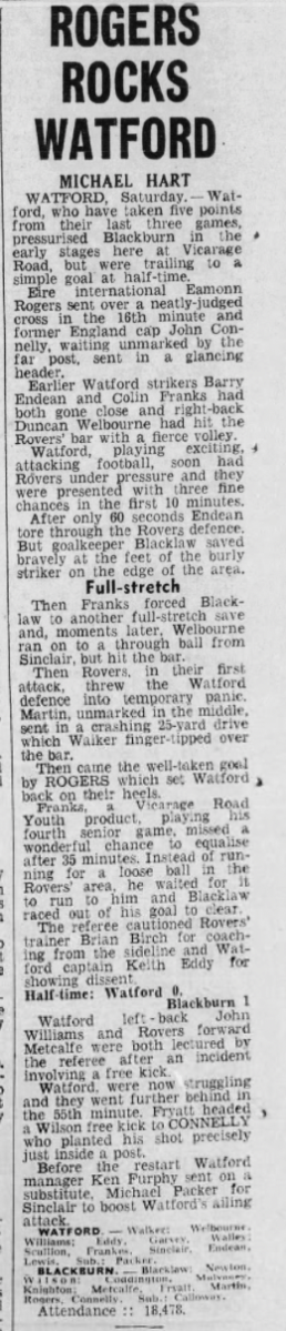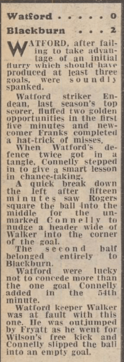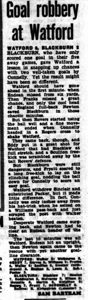 27th September 1969- Division Two, Watford 0 Blackburn Rovers 2 Leave a Reply http://watford.fcdb.info?id=2796 Evening Standard, 27 Sep 1969 Sunday Mirror, 28 Sep 1969 Sunday People,28 Sep 1969 Watford Observer match report Share this: Share on X (Opens in new window) X Share on Facebook (Opens in new window) Facebook