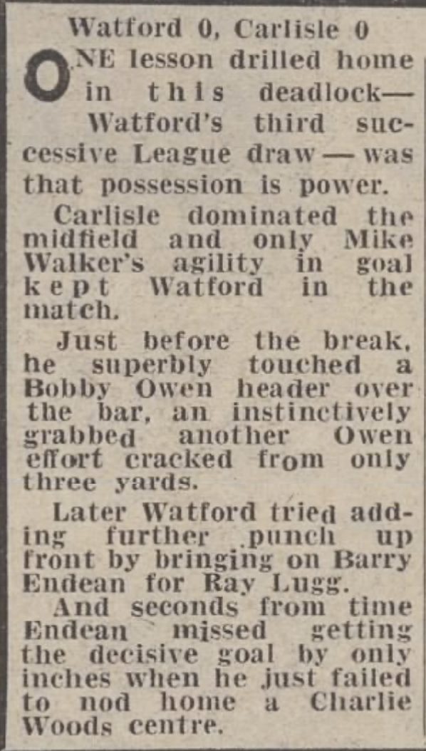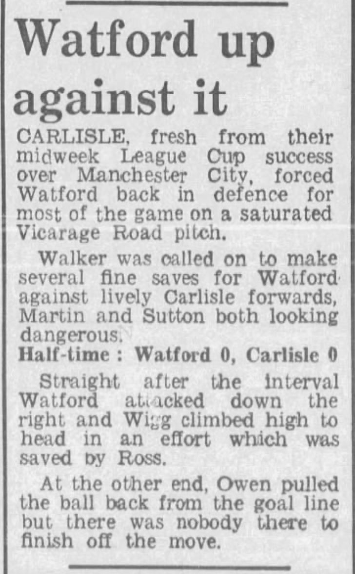 12th September 1970-Division Two, Watford 0 Carlisle United 0 Leave a Reply http://watford.fcdb.info?id=2841 Evening Standard, 12 Sep 1970 Sunday Mirror, 13 Sep 1970 Sunday People, 13 Sep 1970 Watford Observer match report Share this: Share on X (Opens in new window) X Share on Facebook (Opens in new window) Facebook