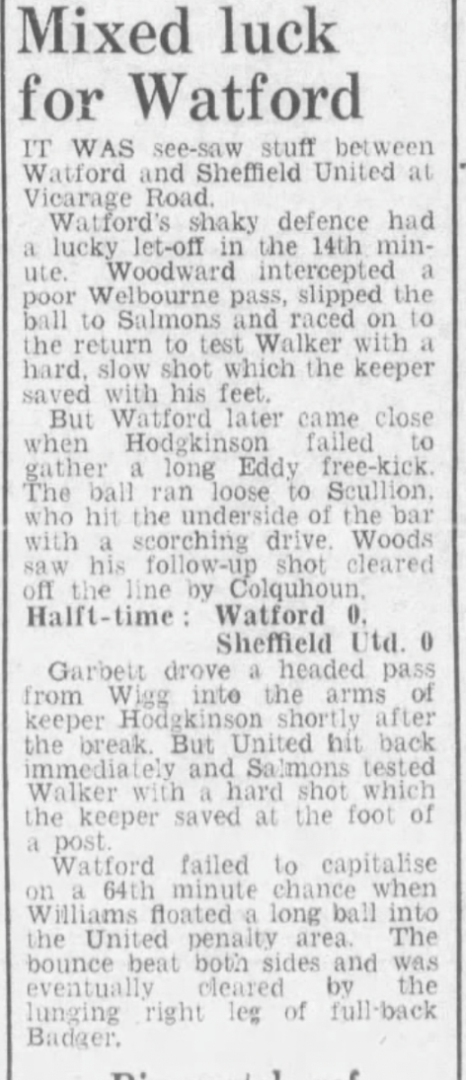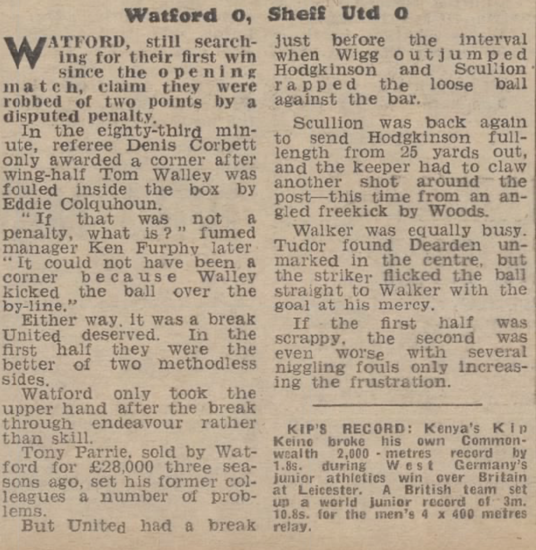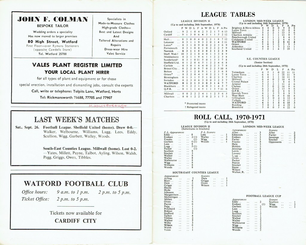 26th September 1970- Division Two, Watford 0 Sheffield United 0 Leave a Reply http://watford.fcdb.info?id=2843 Evening Standard, 26 Sep 1970 Sunday Mirror, 27 Sep 1970 Sunday People, 27 Sep 1970 Watford Observer match report Share this: Share on X (Opens in new window) X Share on Facebook (Opens in new window) Facebook