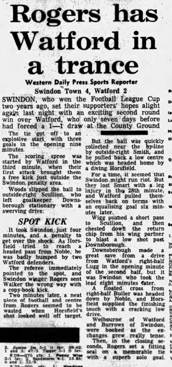 8th September 1970- League Cup Second Round, Swindon Town 4 Watford 2 Leave a Reply http://watford.fcdb.info?id=2840 Western Daily Press, 9 Sep 1970 Watford Observer match report Share this: Share on X (Opens in new window) X Share on Facebook (Opens in new window) Facebook