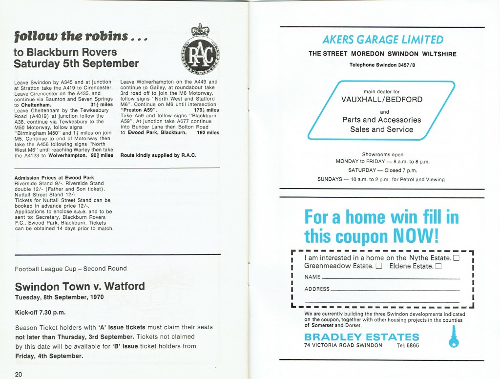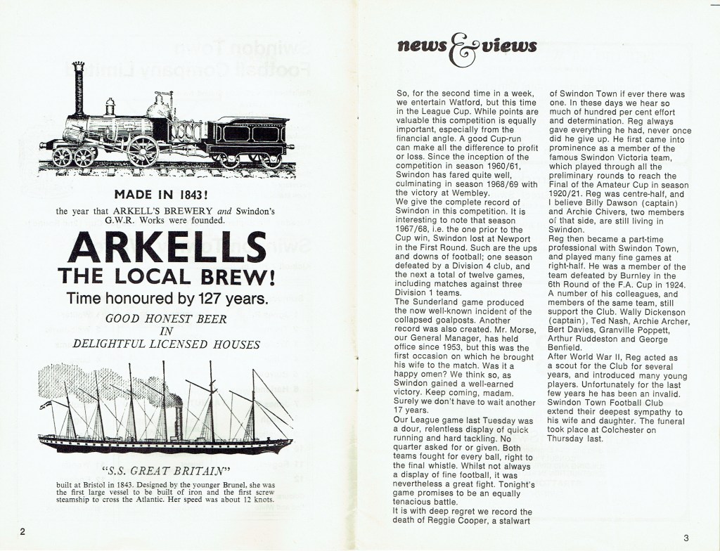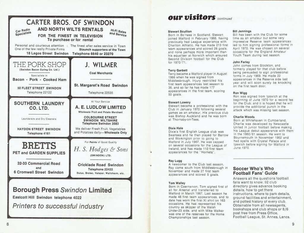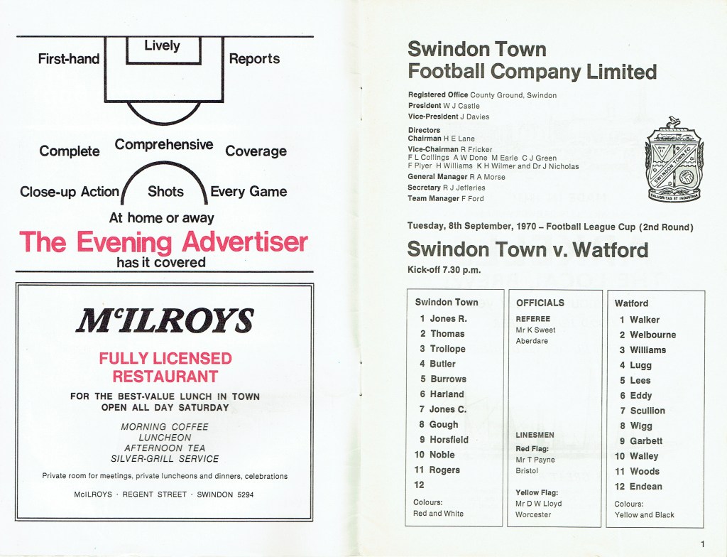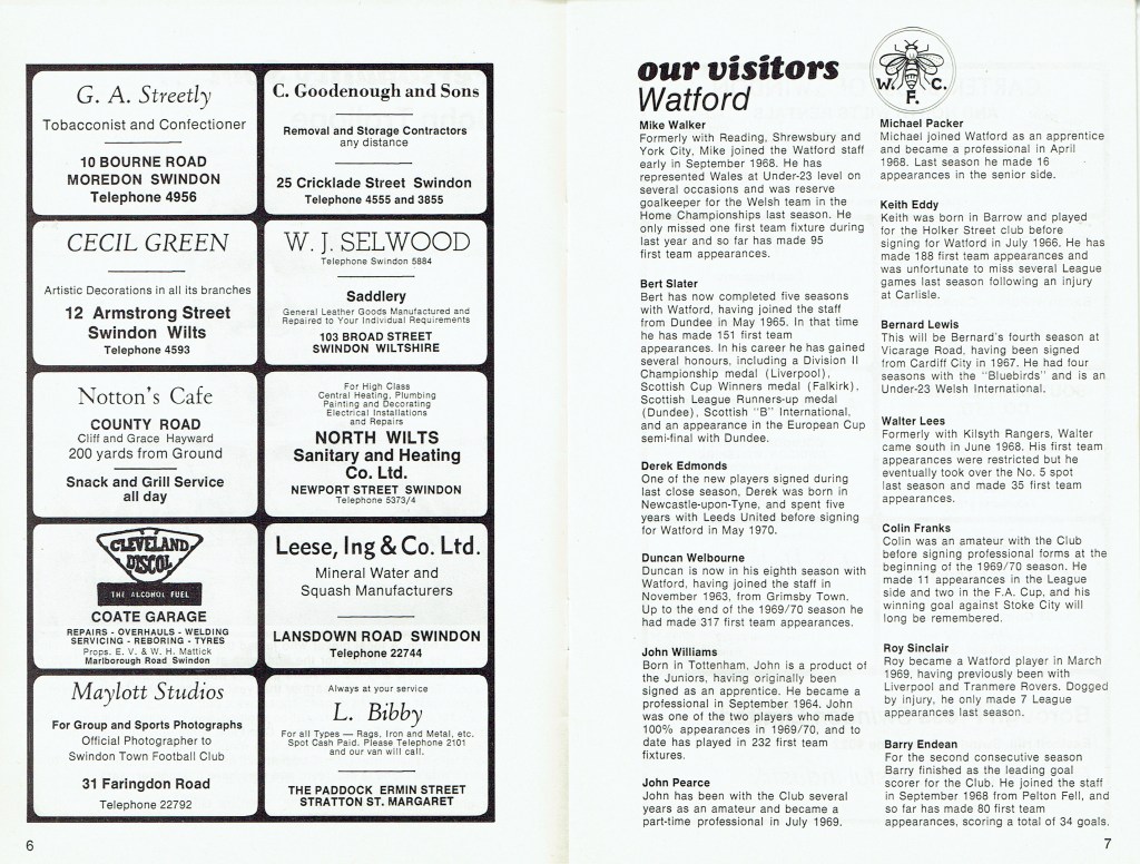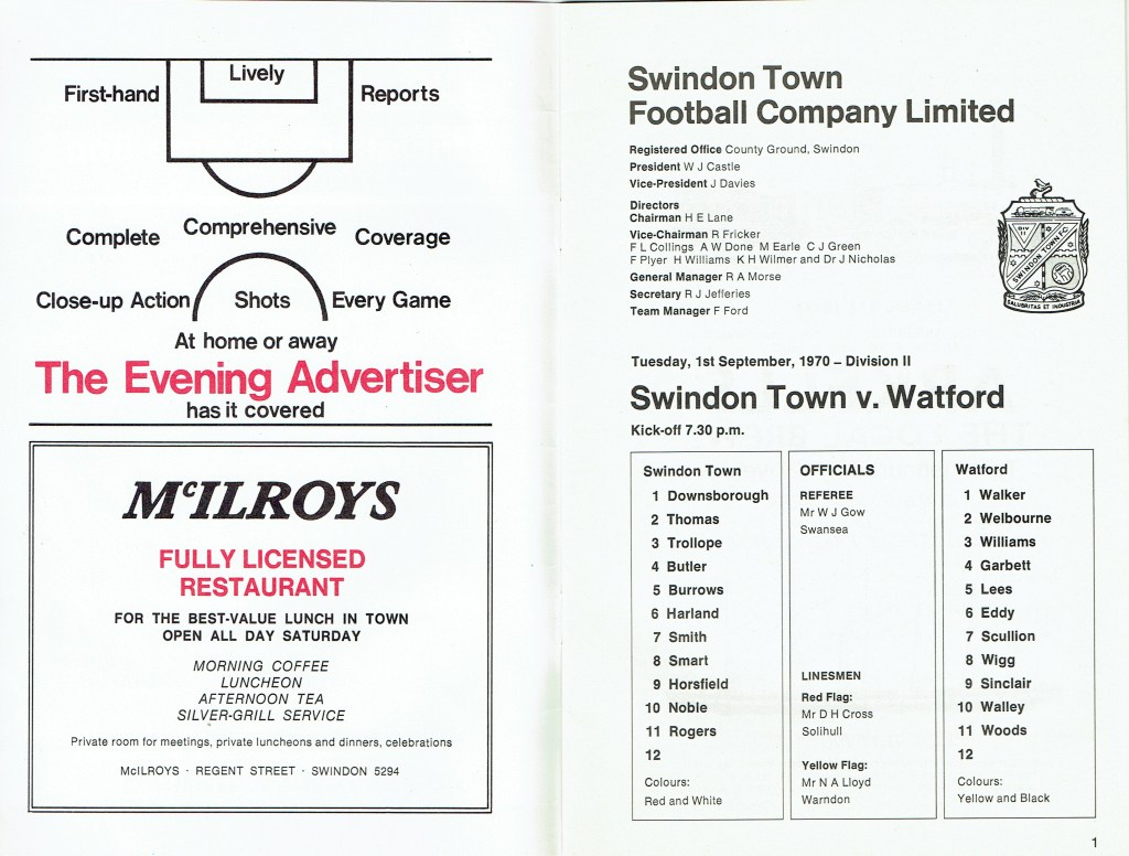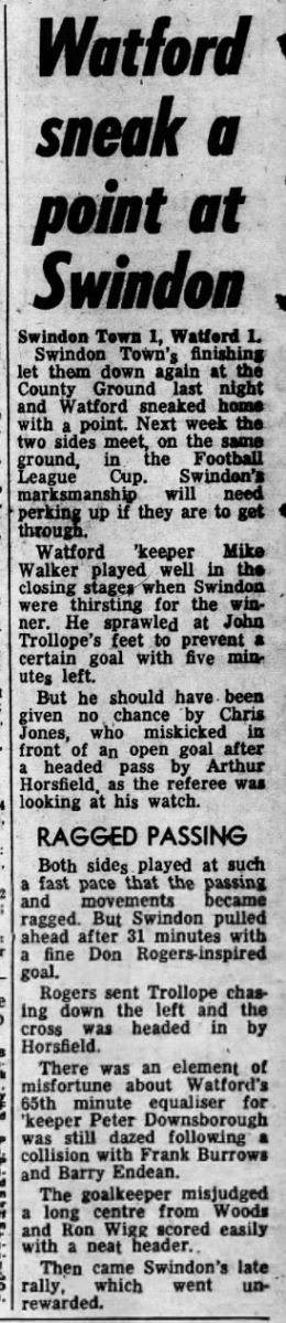 1st September 1970- Division Two, Swindon Town 1 Watford 1 Leave a Reply http://watford.fcdb.info?id=2838 Bristol Evening Post, 2 Sep 1970 Watford Observer match report Share this: Share on X (Opens in new window) X Share on Facebook (Opens in new window) Facebook