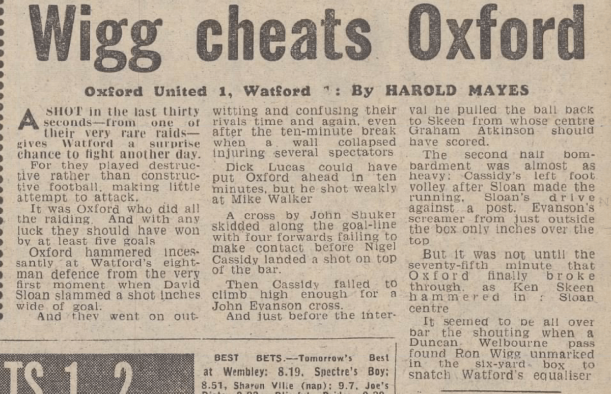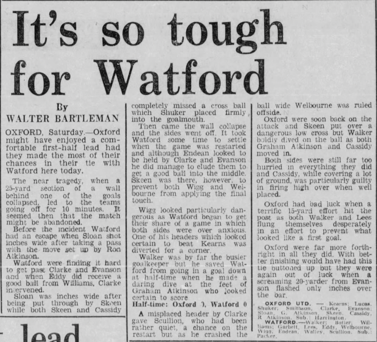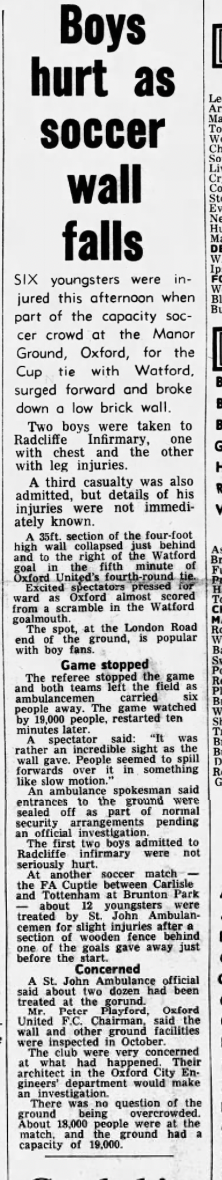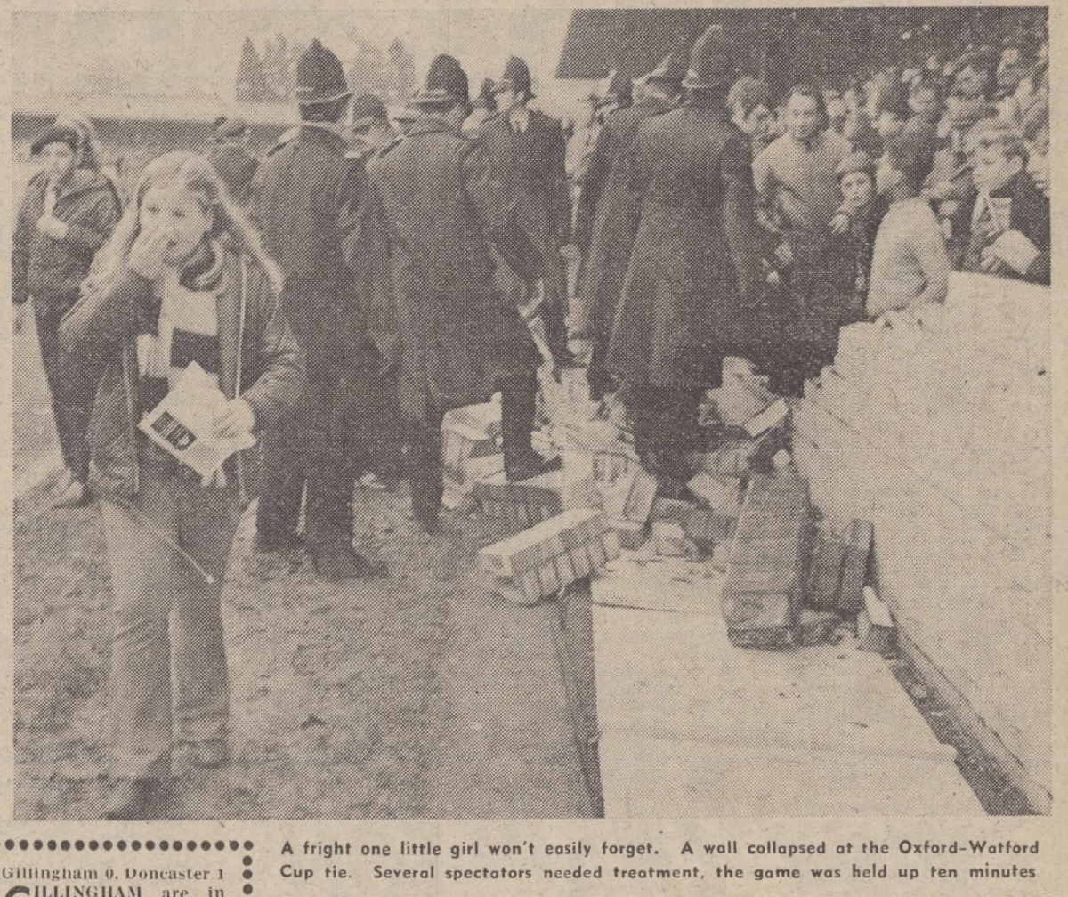 A wall collapsed behind one of the goals early in the game injuring six supporters. The game resumed after a 10 minute stoppage. In the programme notes for the replay it was noted that none of the injuries were serious.