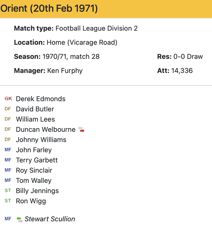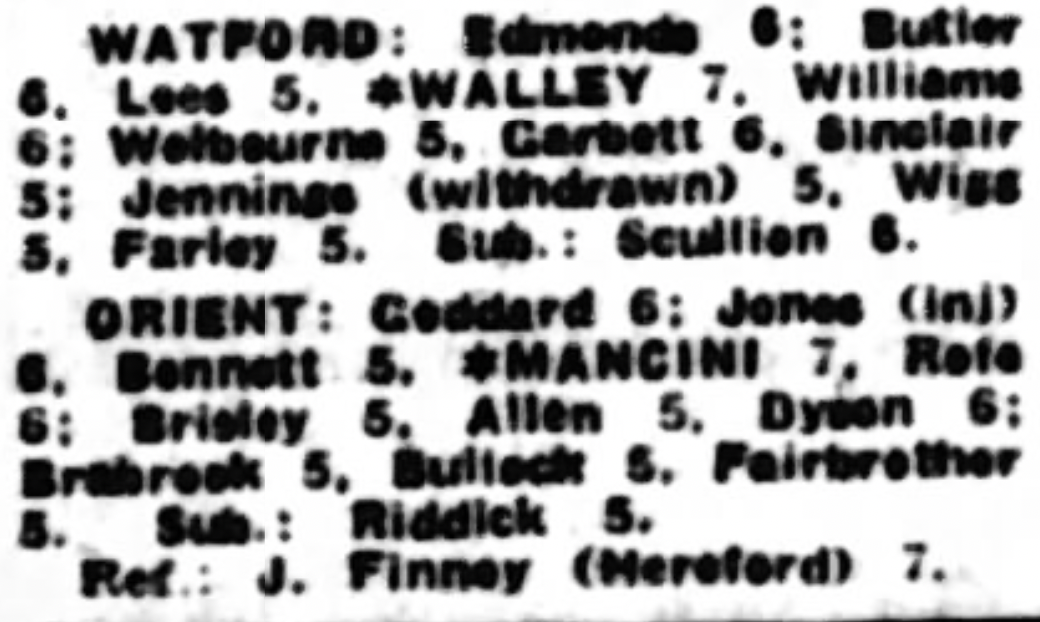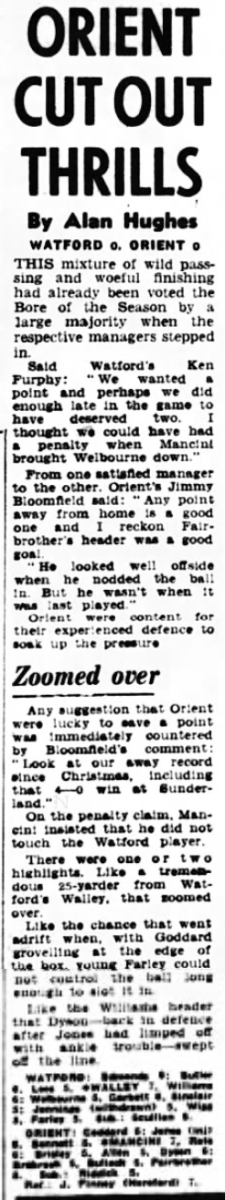 20th February 1971- Division Two, Watford 0 Orient 0 Leave a Reply http://watford.fcdb.info/index.php?page=matches Watford Observer match report Evening Standard, 20 Feb 1971 Sunday Mirror, 20 Feb 1971 Sunday People, 20 Feb 1971 https://www.soccerbase.com/matches/results.sd?date=1971-02-20 https://www.11v11.com/league-tables/league-division-two/20-february-1971/ Share this: Share on X (Opens in new window) X Share on Facebook (Opens in new window) Facebook