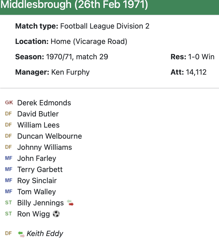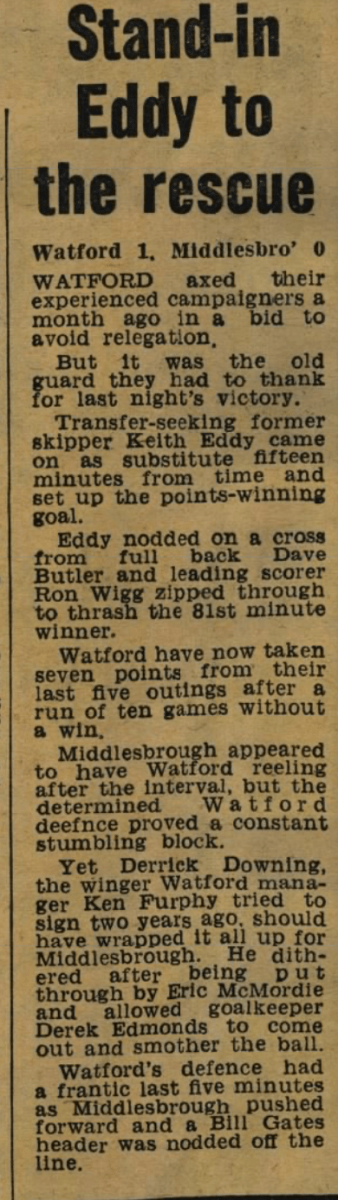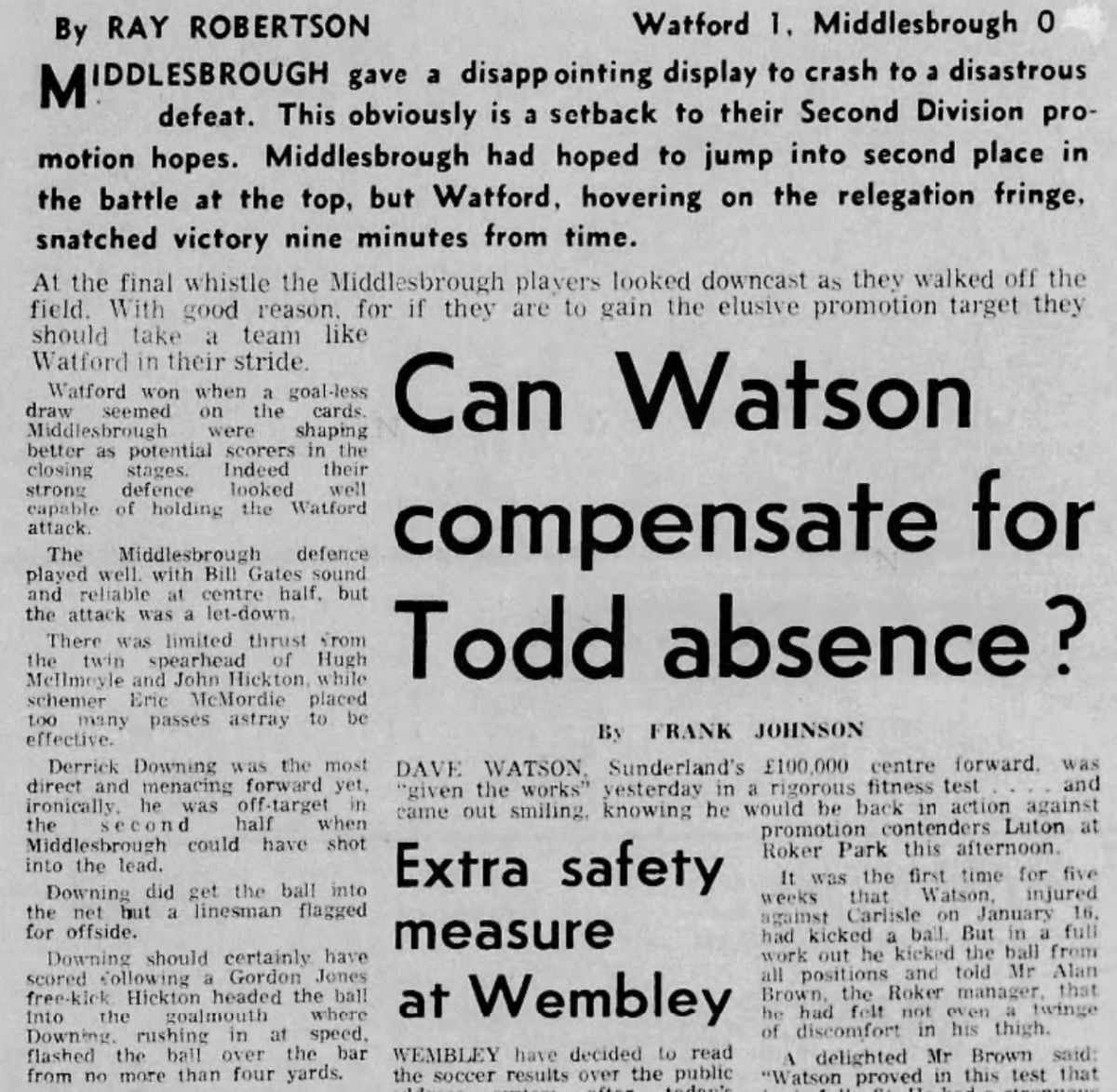 26th February 1971- Division Two, Watford 1 Middlesbrough 0 Leave a Reply http://watford.fcdb.info/index.php?page=matches Daily Mirror, 27 Feb 1971 Northern Echo, 27 Feb 1971 Watford Observer match report Share this: Share on X (Opens in new window) X Share on Facebook (Opens in new window) Facebook