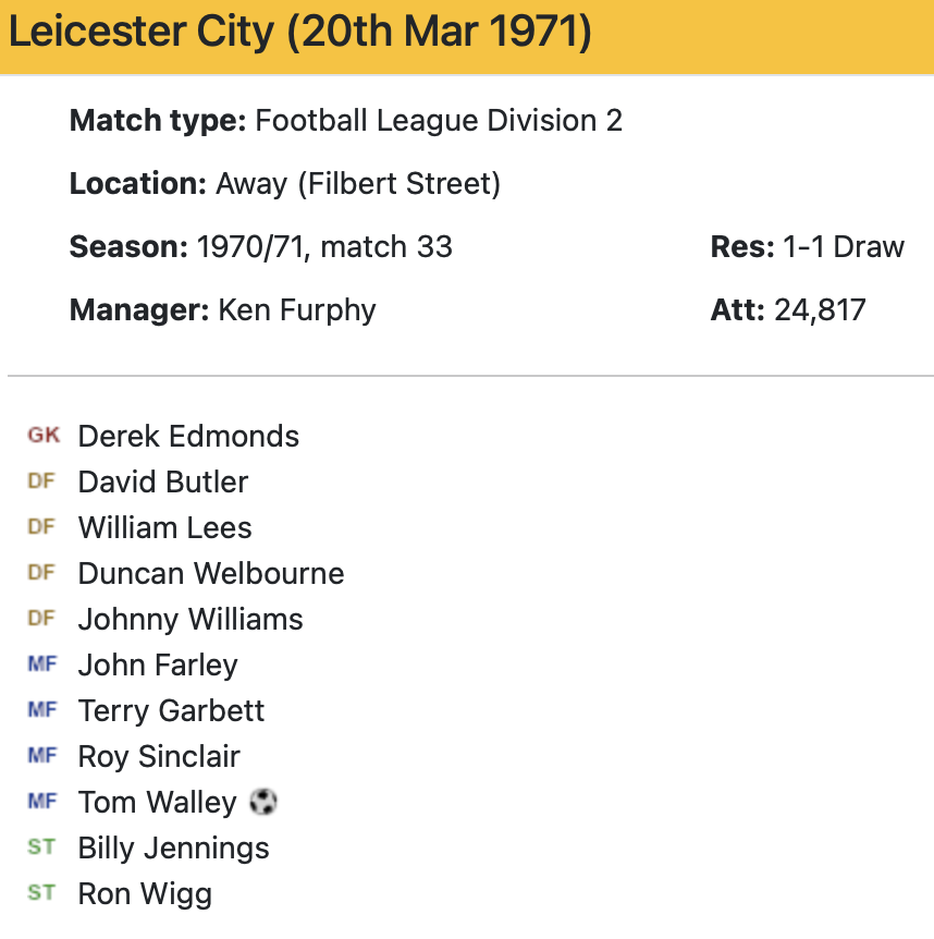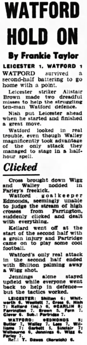 20th March 1971- Division Two, Leicester City 1 Watford 1 Leave a Reply http://watford.fcdb.info/index.php?page=matches Evening Standard, 20 Mar 1971 Sunday Mirror, 20 Mar 1971 Sunday People, 21 Mar 1971 Watford Observer match report https://www.soccerbase.com/matches/results.sd?date=1971-03-20 https://www.11v11.com/league-tables/league-division-two/20-march-1971/ Share this: Share on X (Opens in new window) X Share on Facebook (Opens in new window) Facebook