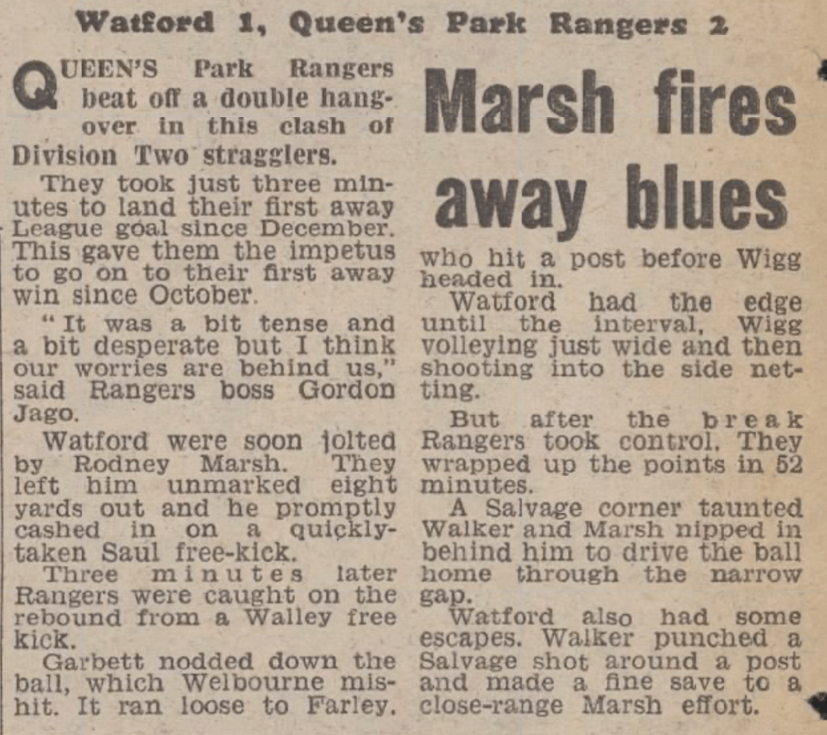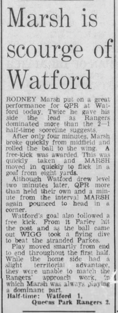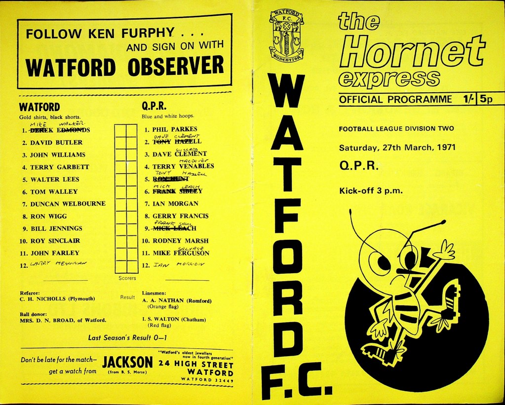 27th March 1971- Division Two, Watford 1 Queens Park Rangers 2 Leave a Reply http://watford.fcdb.info?id=2872 Evening Standard, 27 Mar 1971 Sunday Mirror, 28 Mar 1971 Sunday People, 28 Mar 1971 Watford Observer match report https://www.soccerbase.com/matches/results.sd?date=1971-03-27 https://www.11v11.com/league-tables/league-division-two/27-march-1971/ Share this: Share on X (Opens in new window) X Share on Facebook (Opens in new window) Facebook