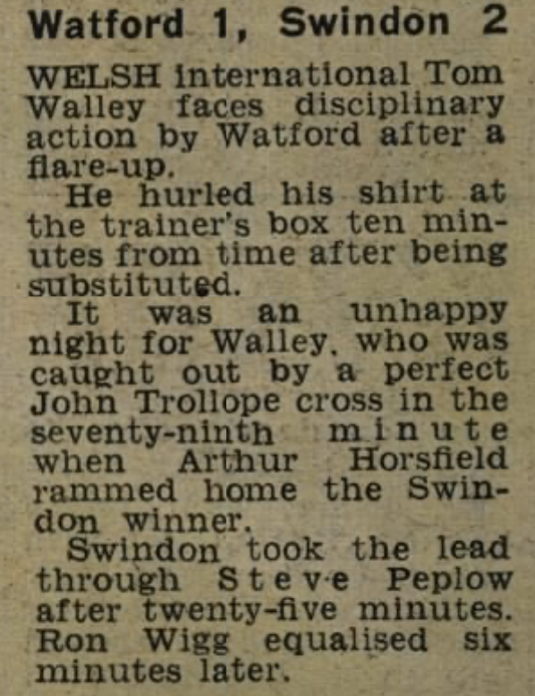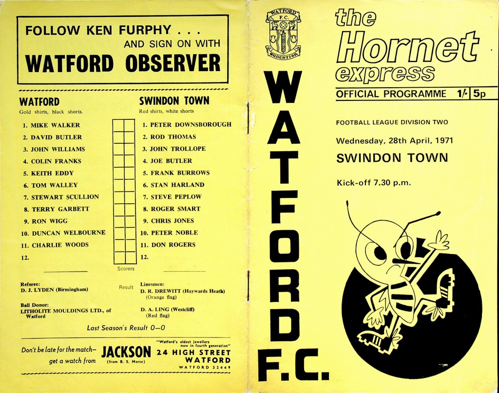 28th April 1971- Division Two, Watford 1 Swindon Town 2 Leave a Reply http://watford.fcdb.info?id=2879 Daily Mirror, 29 Apr 1971 Watford Observer match report https://www.soccerbase.com/matches/results.sd?date=1971-04-28 https://www.11v11.com/league-tables/league-division-two/28-april-1971/ Share this: Share on X (Opens in new window) X Share on Facebook (Opens in new window) Facebook