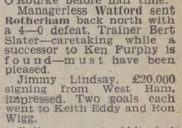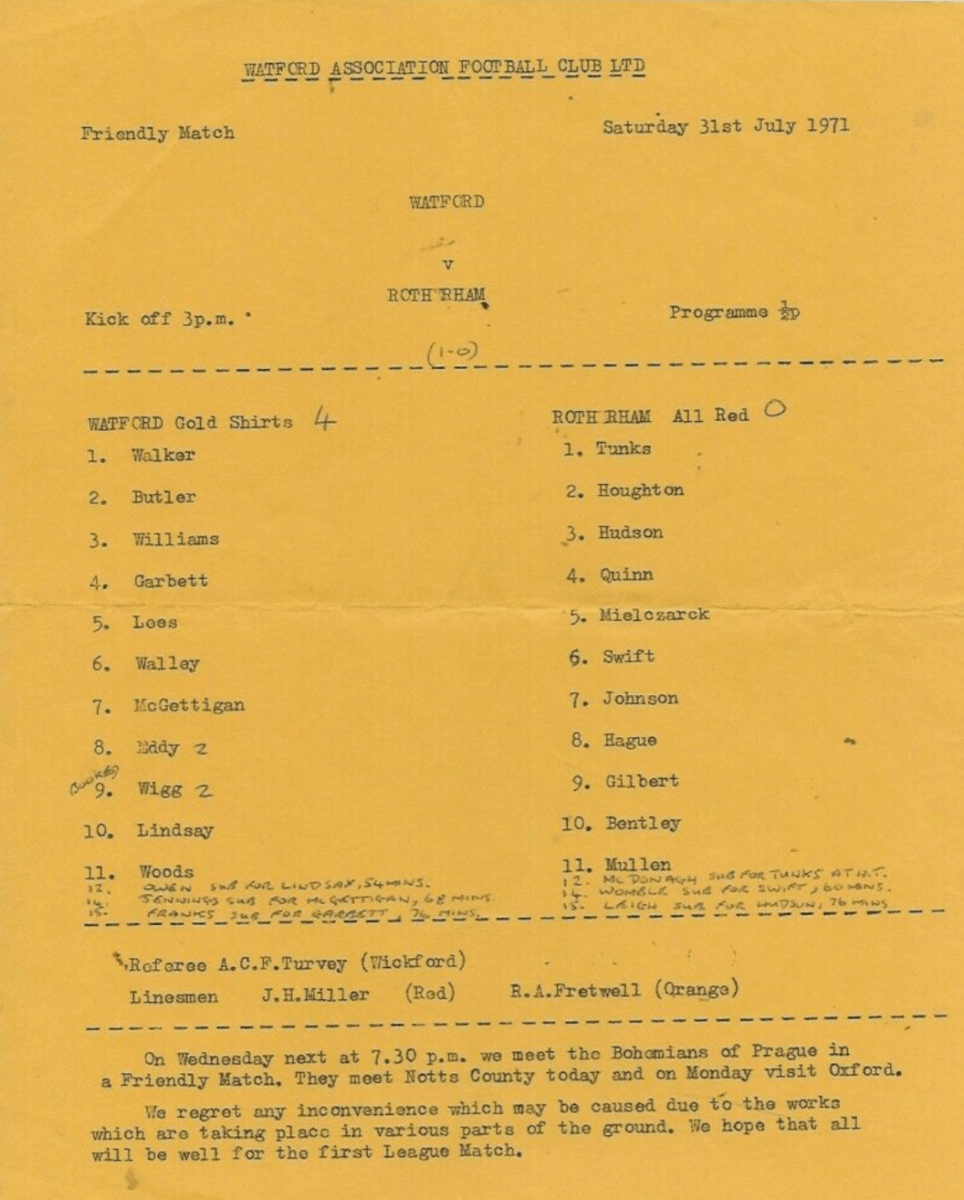 31st July 1971- Friendly, Watford 4 Rotherham United 0 https://www.watfordfcarchive.co.uk/fixture/1971-07-31 Sunday Mirror, 1 Aug 1971 Share this: Share on X (Opens in new window) X Share on Facebook (Opens in new window) Facebook