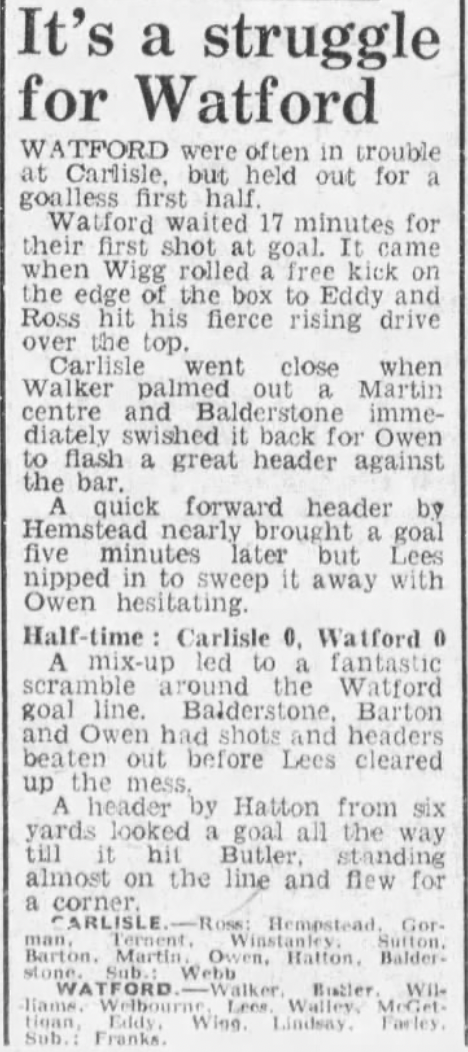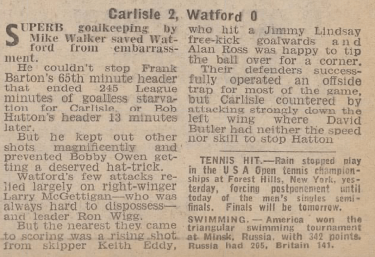 11th September 1971- Division Two, Carlisle United 2 Watford 0 Leave a Reply http://watford.fcdb.info?id=2888 Evening Standard, 11 Sep 1971 Sunday Mirror, 11 Sep 1971 Sunday People, 12 Sep 1971 Watford Observer match report Share this: Share on X (Opens in new window) X Share on Facebook (Opens in new window) Facebook