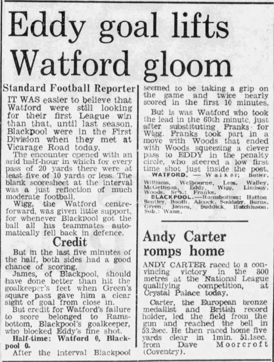 18th September 1971- Division Two, Watford 1 Blackpool 0 Leave a Reply http://watford.fcdb.info?id=2889 Evening Standard, 18 Sep 1971 Watford Observer match report Share this: Share on X (Opens in new window) X Share on Facebook (Opens in new window) Facebook