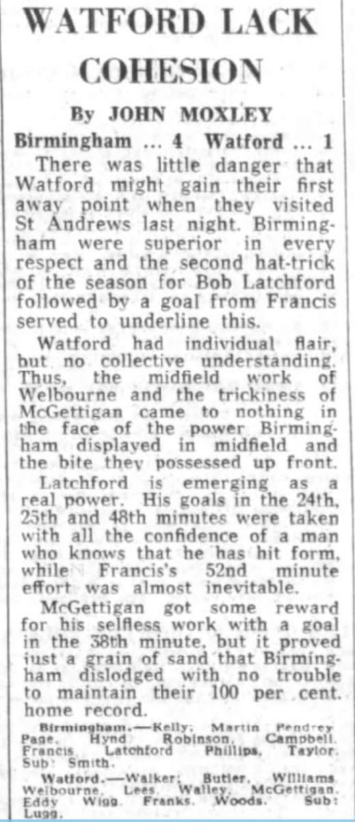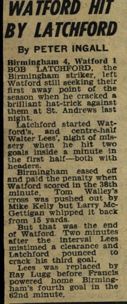 28th September 1971- Division Two, Birmingham City 4 Watford 1 Leave a Reply http://watford.fcdb.info?id=2891 Daily Mirror, 29 Sep 1971 Daily Telegraph, 29 Sep 1971 Watford Observer match report Share this: Share on X (Opens in new window) X Share on Facebook (Opens in new window) Facebook