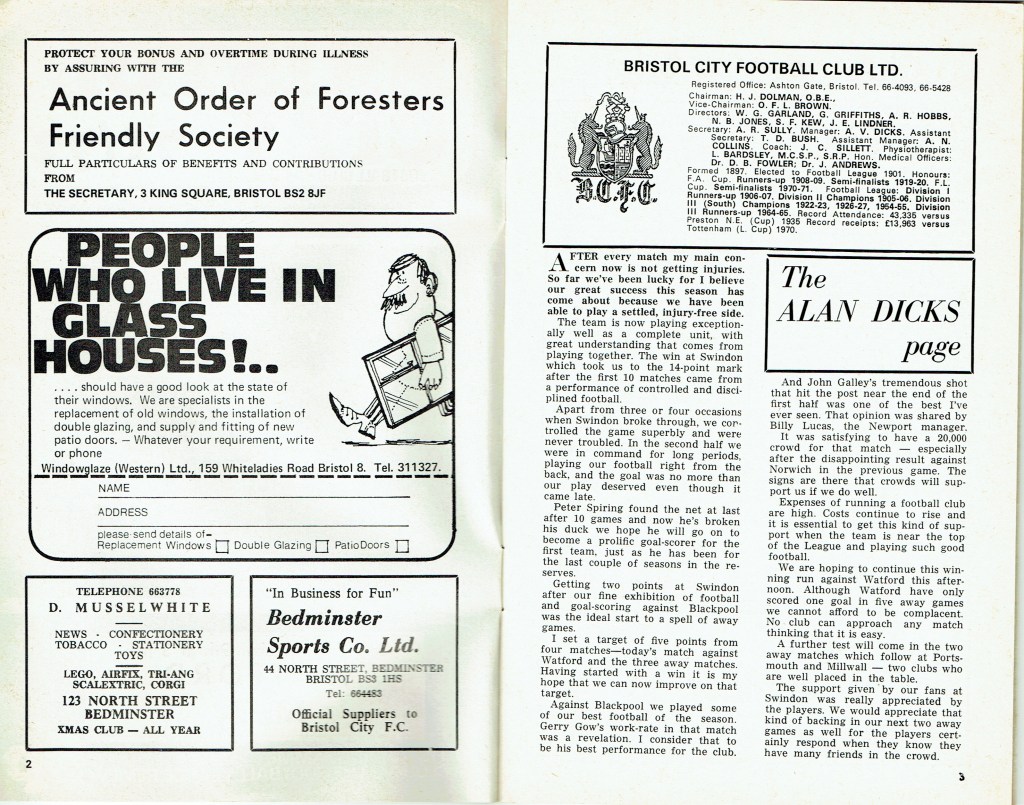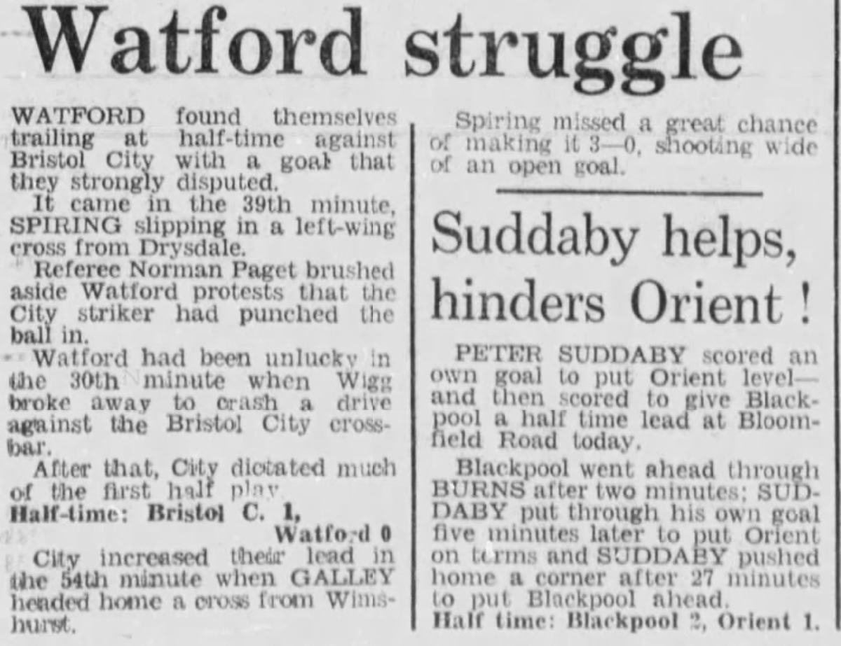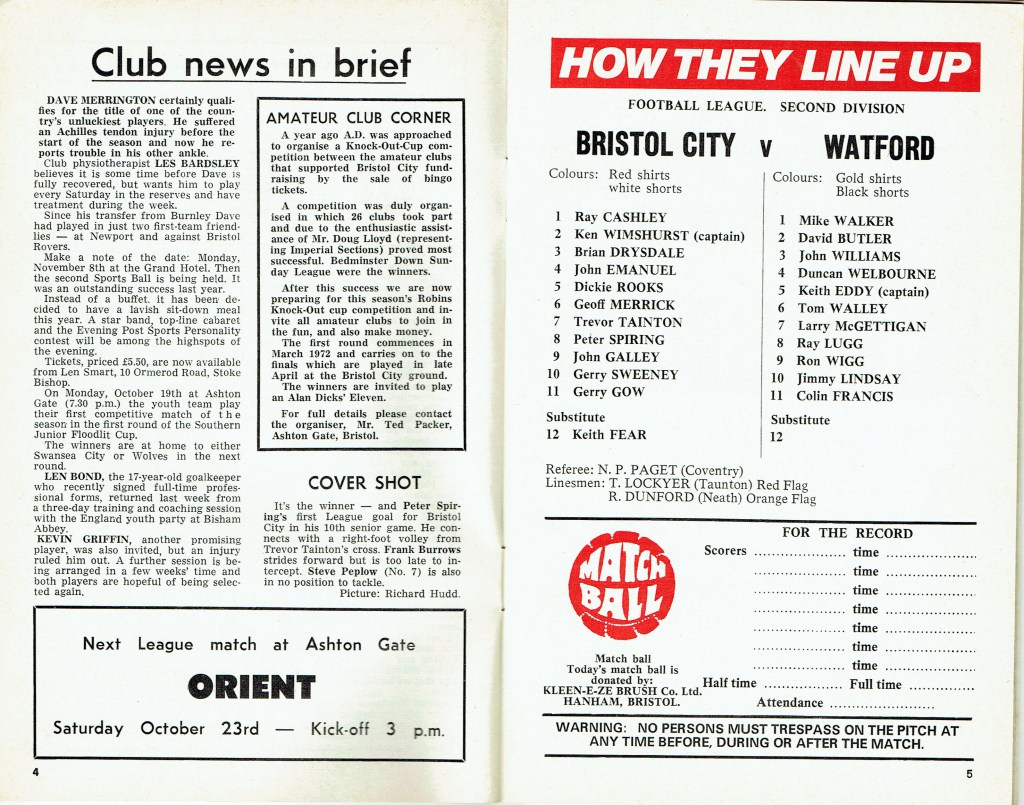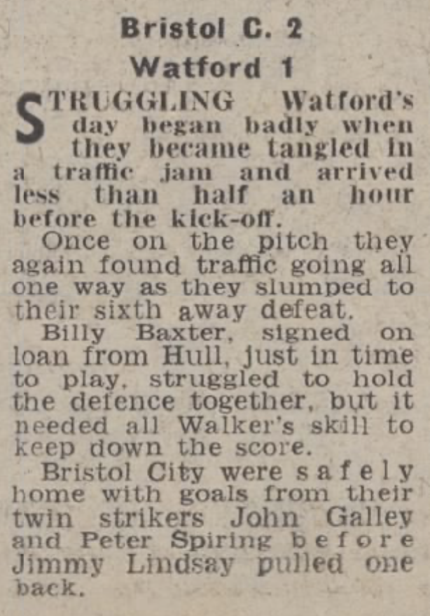 9th October 1971- Division Two, Bristol City 2 Watford 1 Leave a Reply http://watford.fcdb.info?id=2894 Evening Standard, 9 Oct 1971 Sunday Mirror, 10 Oct 1971 Sunday People, 10 Oct 1971 Watford Observer match report https://www.soccerbase.com/matches/results.sd?date=1971-10-09 https://www.11v11.com/league-tables/league-division-two/09-october-1971/ Share this: Share on X (Opens in new window) X Share on Facebook (Opens in new window) Facebook