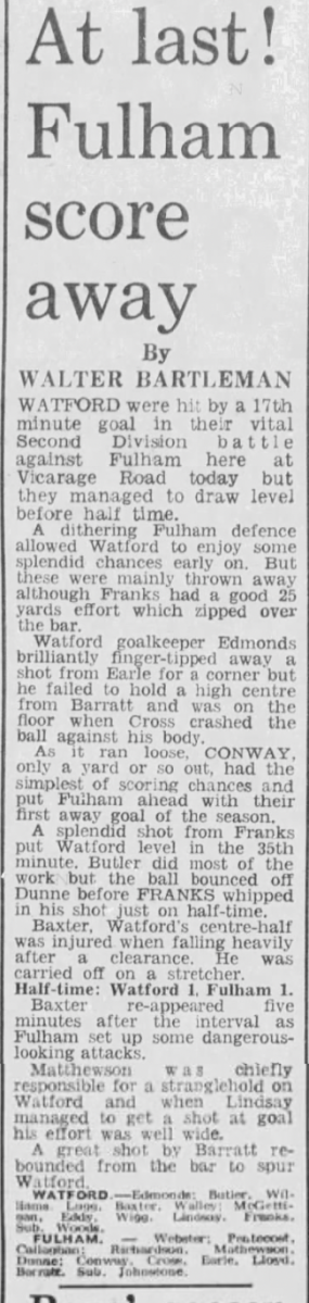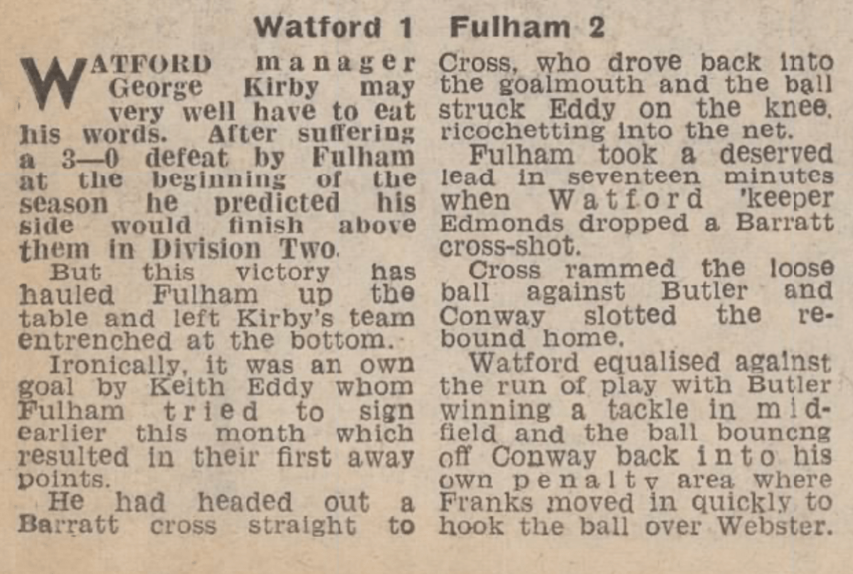 16th October 1971-Division Two, Watford 1 Fulham 2 Leave a Reply http://watford.fcdb.info?s=31974&id=2896 Evening Standard, 16 Oct 1971 Sunday Mirror, 17 Oct 1971 Sunday People, 17 Oct 1971 Watford Observer match report Share this: Share on X (Opens in new window) X Share on Facebook (Opens in new window) Facebook