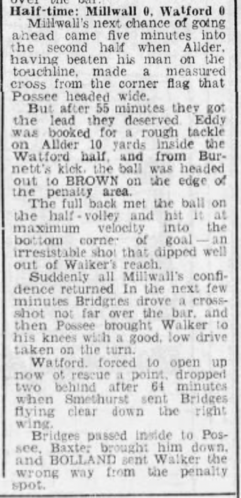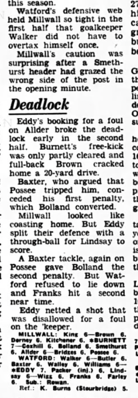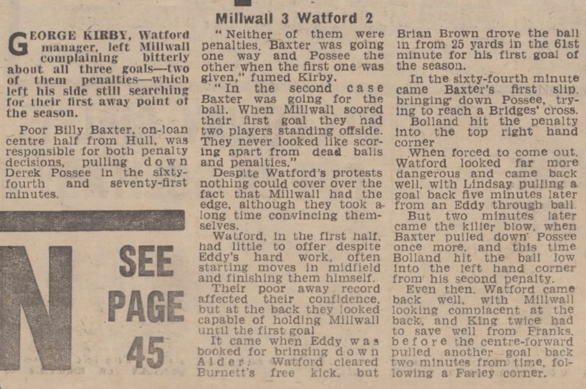 6th November 1971- Division Two, Millwall 3 Watford 2 Leave a Reply http://watford.fcdb.info?s=36353&id=2900 Evening Standard, 6 Nov 1971 Sunday Mirror, 7 Nov 1971 Sunday People, 7 Nov 1971 Watford Observer match report Share this: Share on X (Opens in new window) X Share on Facebook (Opens in new window) Facebook
