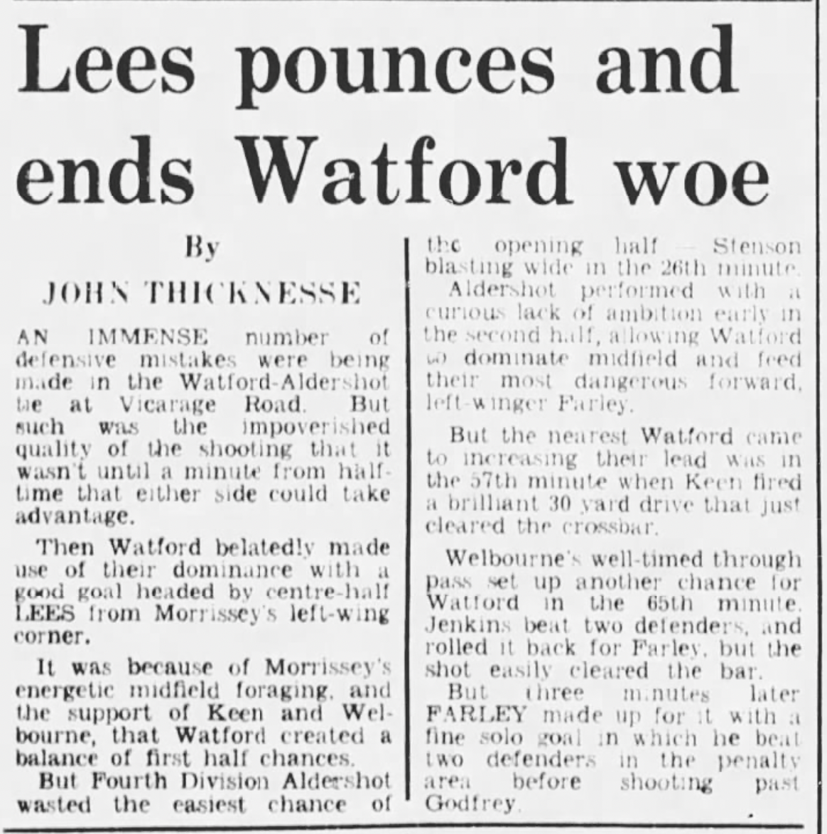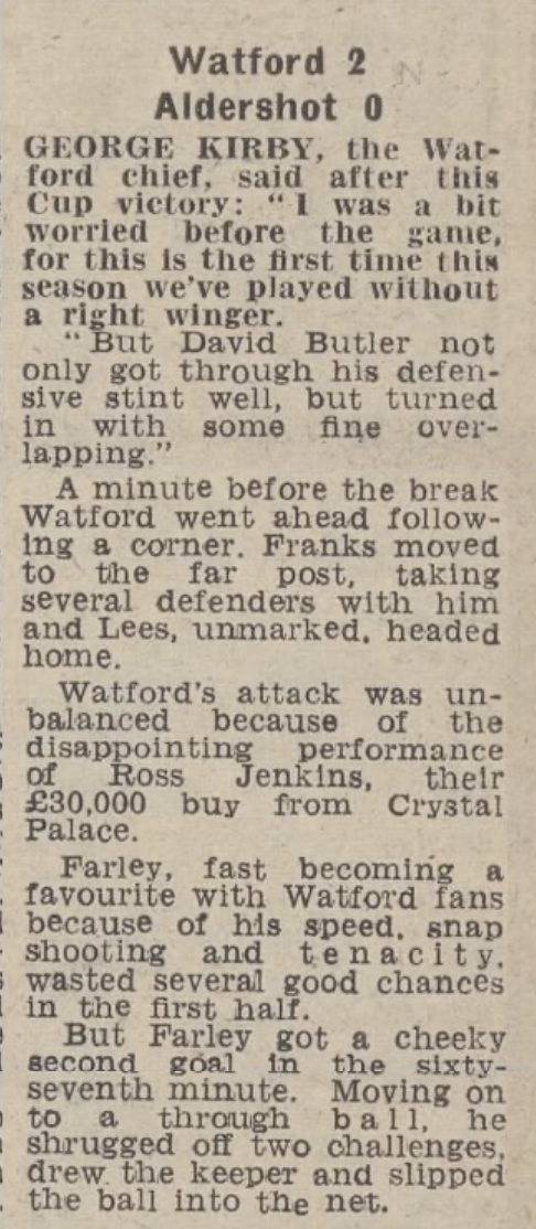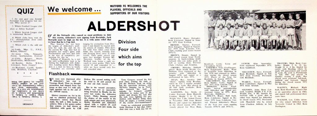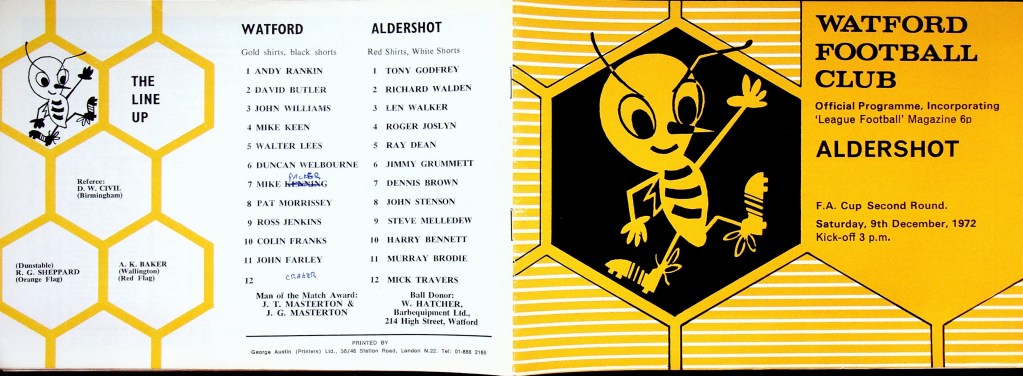 9th December 1972- FA Cup Second Round, Watford 2 Aldershot 0 Leave a Reply https://watford.fcdb.info/index.php?page=matches Evening Standard, 9 Dec 1972 Sunday Mirror, 10 Dec 1972 Sunday People, 10 Dec 1972 Watford Observer match report Share this: Share on X (Opens in new window) X Share on Facebook (Opens in new window) Facebook
