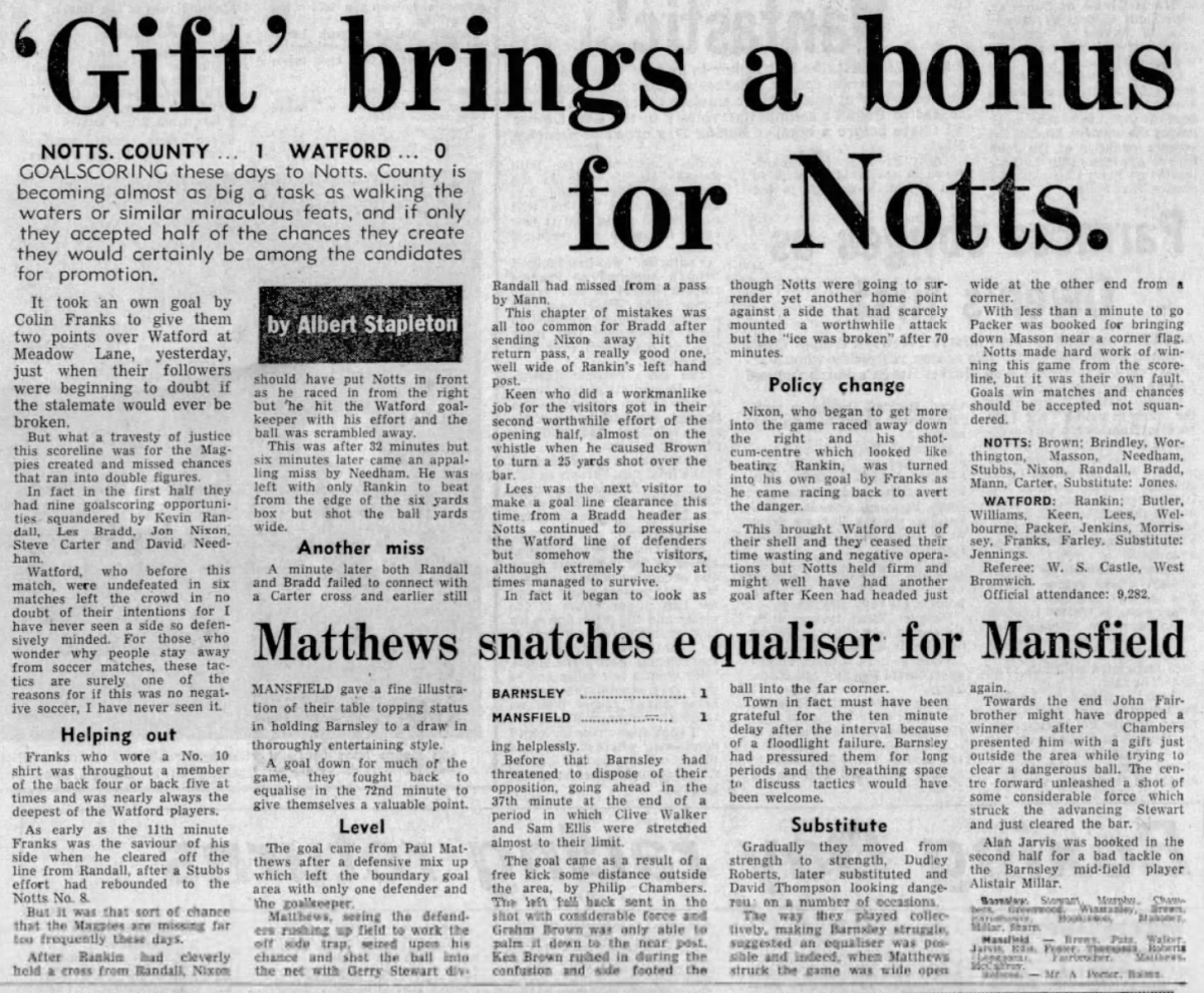 26th December 1972- Division Three, Notts County 1 Watford 0 Leave a Reply http://watford.fcdb.info?id=2953 Nottingham Guardian Journal, 27 Dec 1972 Watford Observer match report https://www.soccerbase.com/matches/results.sd?date=1972-12-26 https://www.11v11.com/league-tables/league-division-three/26-december-1972/ Share this: Share on X (Opens in new window) X Share on Facebook (Opens in new window) Facebook