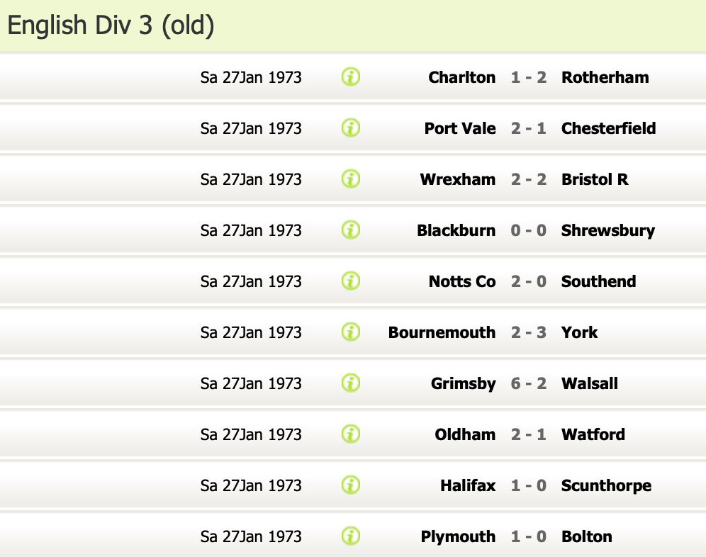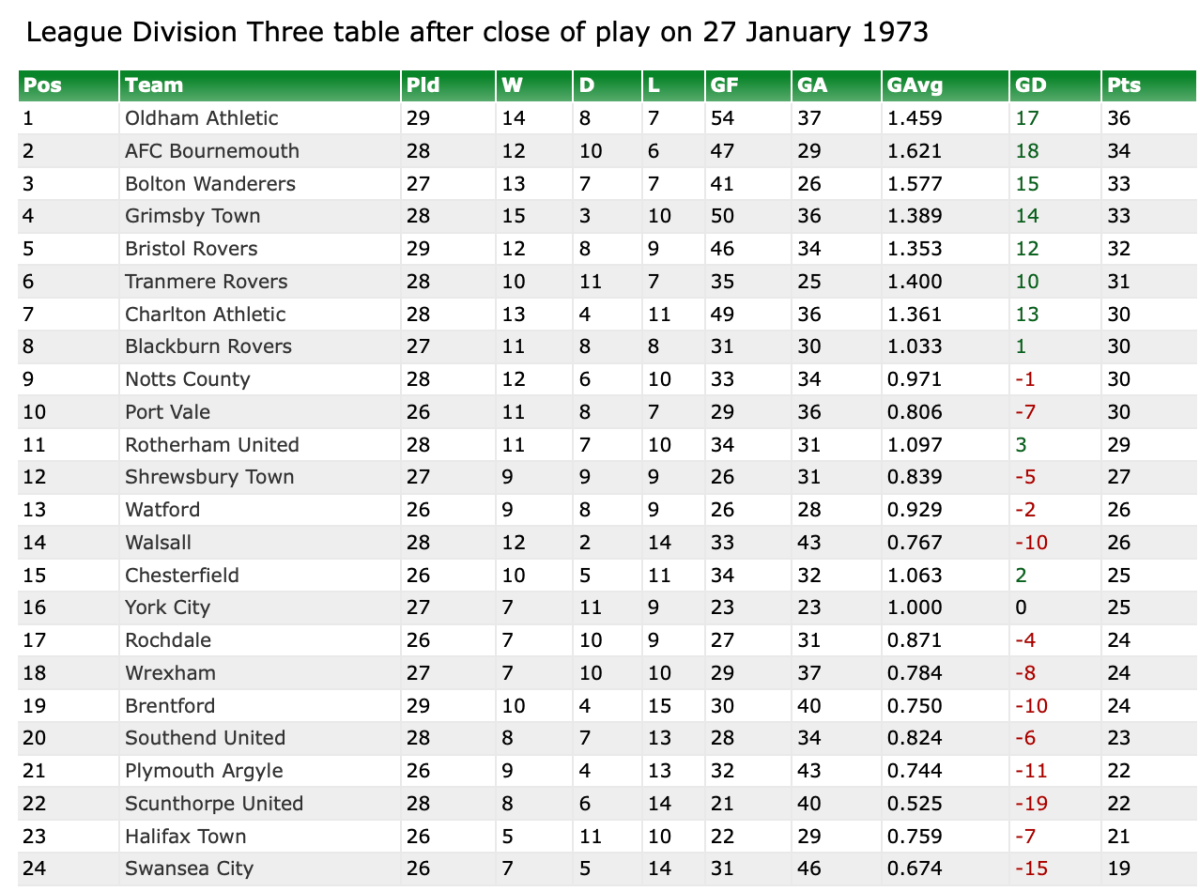 27th January 1973- Division Three, Oldham Athletic 2 Watford 1 https://watford.fcdb.info/index.php?page=matches Sunday People, 28 January 1973 Watford Observer match report https://www.soccerbase.com/matches/results.sd?date=1973-01-27 https://www.11v11.com/league-tables/league-division-three/27-january-1973/ Share this: Share on X (Opens in new window) X Share on Facebook (Opens in new window) Facebook