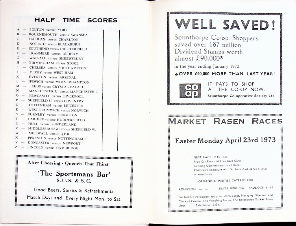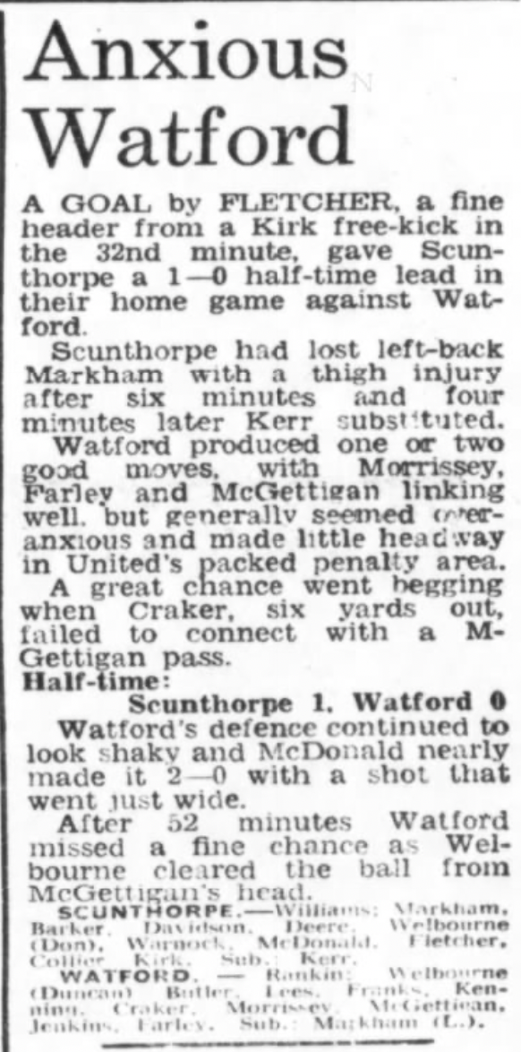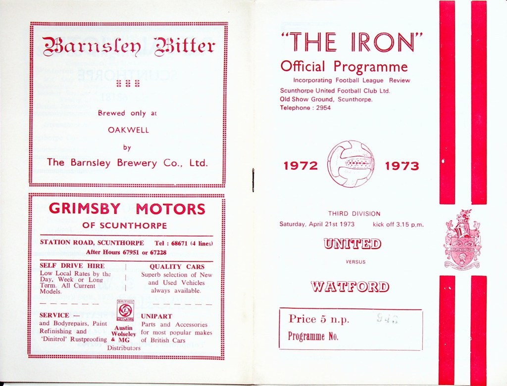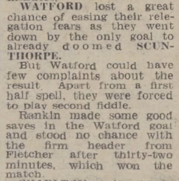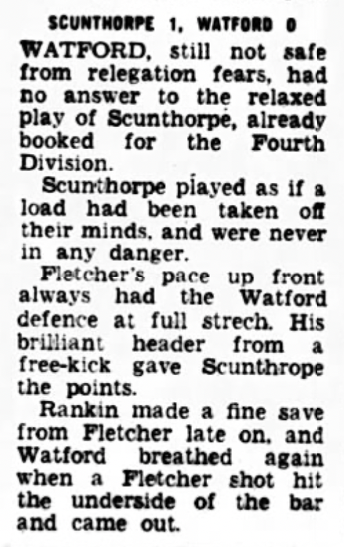 21st April 1973- Division Three, Scunthorpe United 1 Watford 0 Leave a Reply http://watford.fcdb.info?id=2975 Evening Standard, 21 Apr 1973 Sunday People, 22 Apr 1973 Sunday Mirror, 22 Apr 1973 Watford Observer match report https://www.soccerbase.com/matches/results.sd?date=1973-04-21 https://www.11v11.com/league-tables/league-division-three/21-april-1973/ Share this: Click to share on X (Opens in new window) X Click to share on Facebook (Opens in new window) Facebook