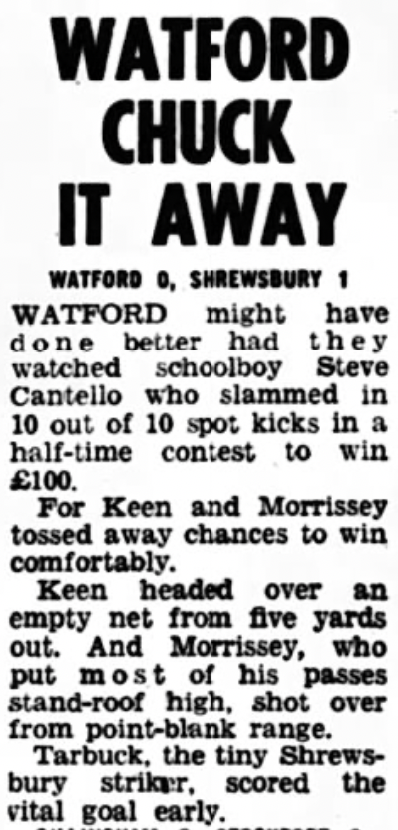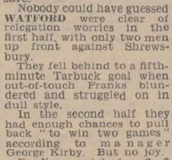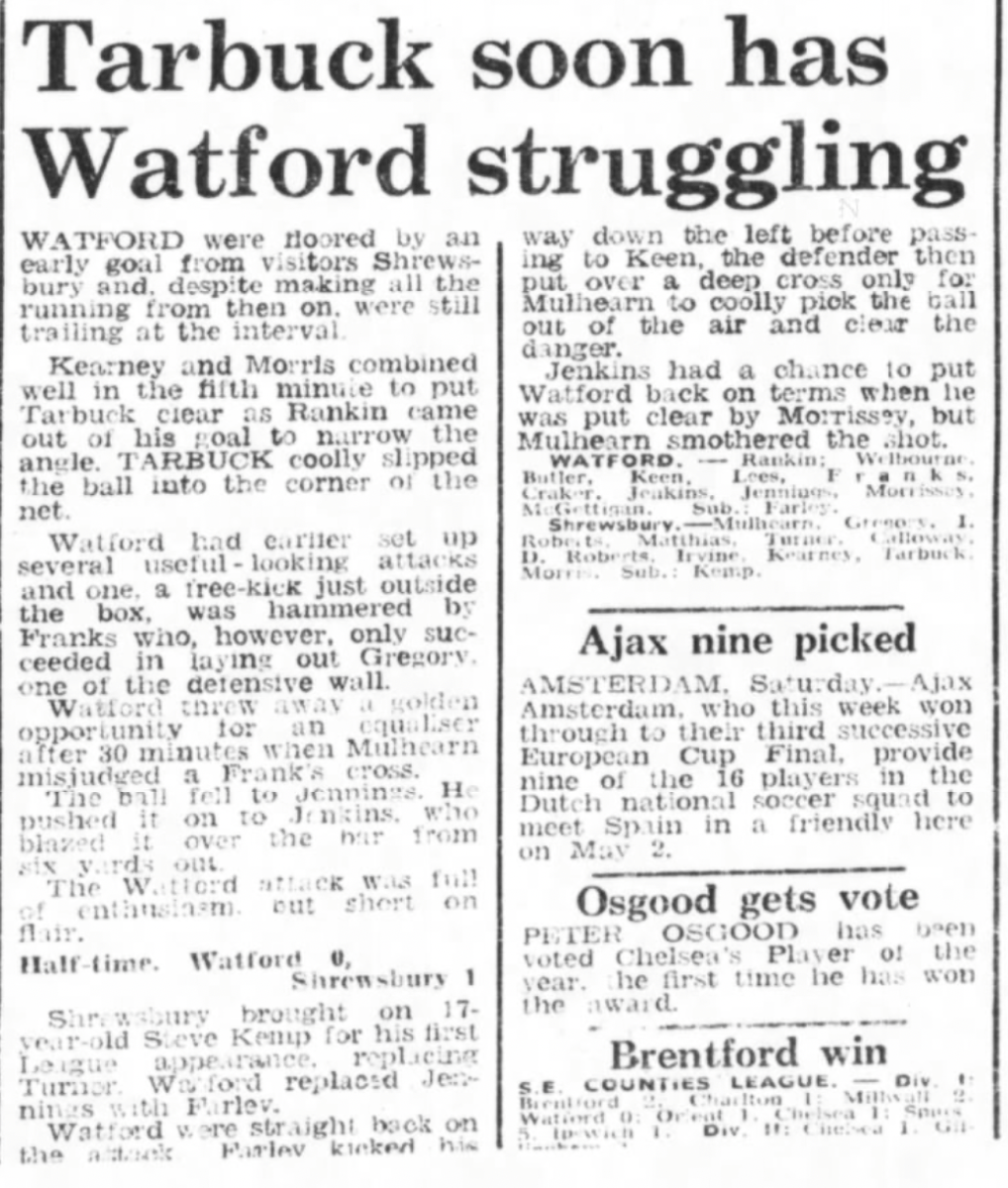28th April 1973- Division Three, Watford 0 Shrewsbury Town 1 Leave a Reply http://watford.fcdb.info?id=2977 Evening Standard, 28 Apr 1973 Sunday People, 29 Apr 1973 Sunday Mirror, 29 Apr 1973 Watford Observer match report https://www.soccerbase.com/matches/results.sd?date=1973-04-28 https://www.11v11.com/league-tables/league-division-three/28-april-1973/ Share this: Click to share on X (Opens in new window) X Click to share on Facebook (Opens in new window) Facebook
