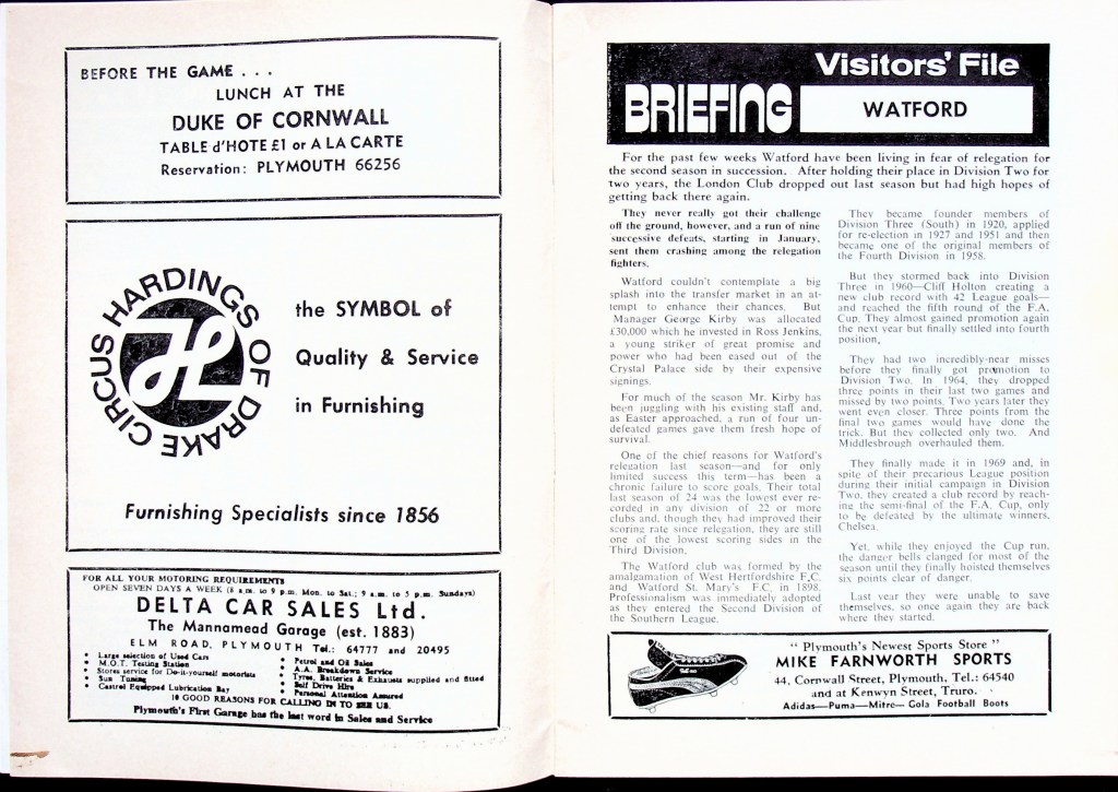 23rd April 1973- Division Three, Plymouth Argyle 1 Watford 1 Leave a Reply The result ensured our survival in the Third Division. http://watford.fcdb.info?id=2976 Daily Mirror, 24 Apr 1973 Watford Observer match report https://www.soccerbase.com/matches/results.sd?date=1973-04-23 https://www.11v11.com/league-tables/league-division-three/23-april-1973/ Share this: Click to share on X (Opens in new window) X Click to share on Facebook (Opens in new window) Facebook