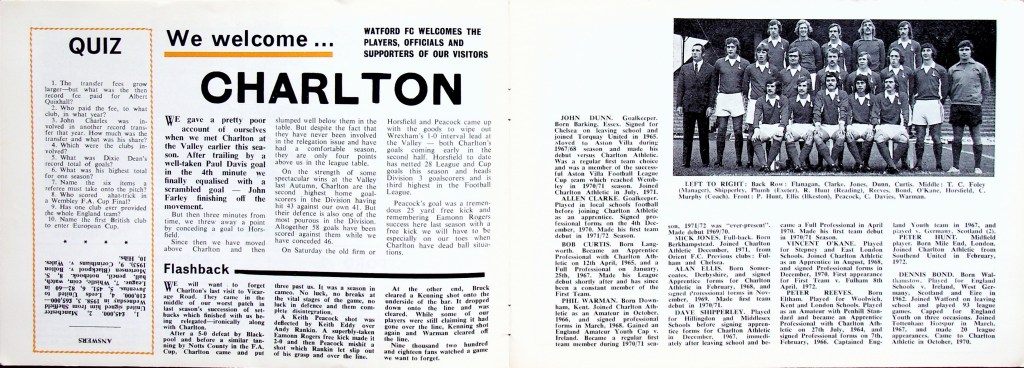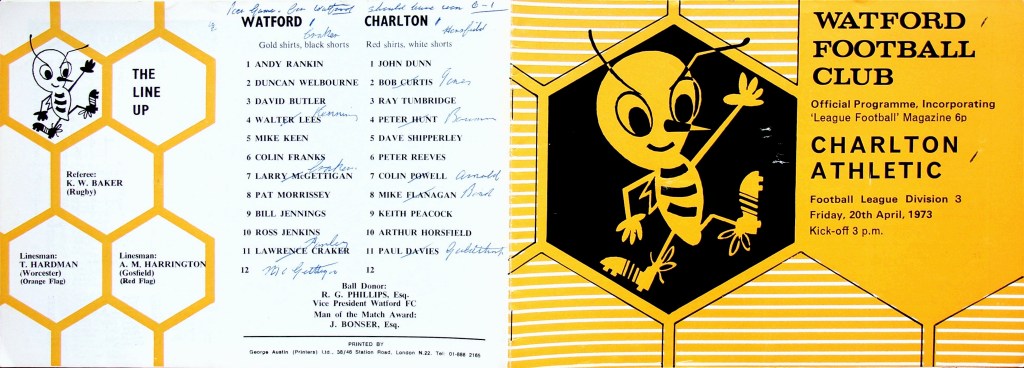 20th April 1973- Division Three, Watford 1 Charlton Athletic 1 Leave a Reply Watford Observer match report http://watford.fcdb.info?id=2974 https://www.soccerbase.com/matches/results.sd?date=1973-04-20 https://www.11v11.com/league-tables/league-division-three/20-april-1973/ Share this: Click to share on X (Opens in new window) X Click to share on Facebook (Opens in new window) Facebook