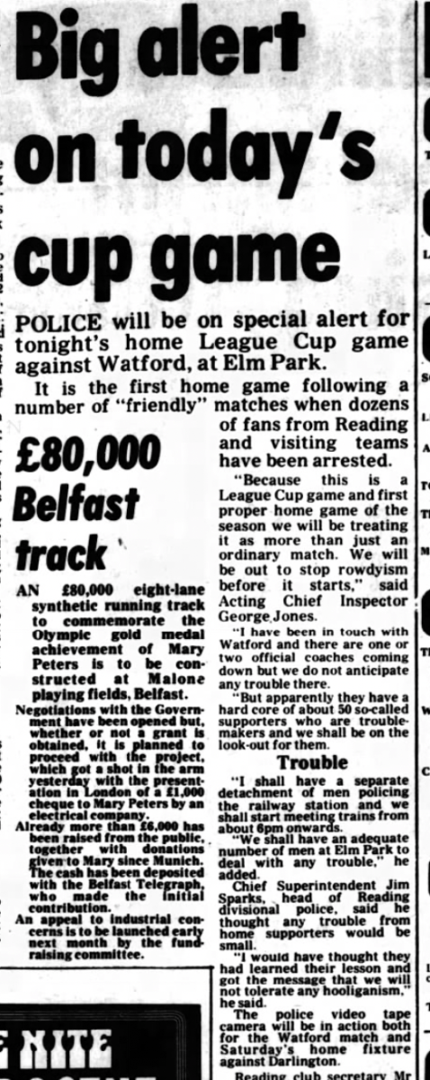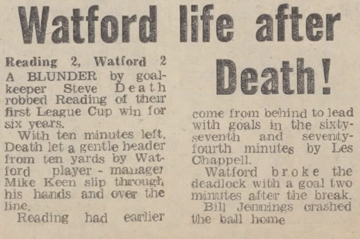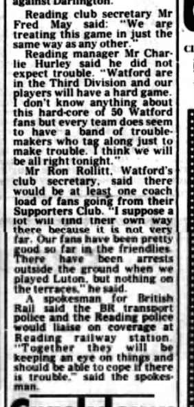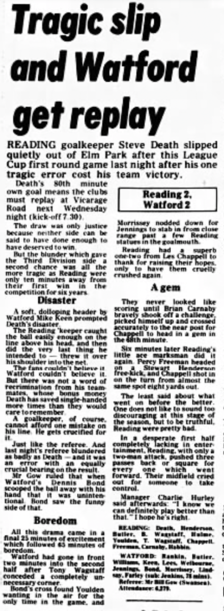 29th August 1973- League Cup First Round, Reading 2 Watford 2 Leave a Reply Reading Evening Post, 29 Aug 1973 There was nothing I could see in the 30th Aug edition of the Post about the 50 Watford troublemakers the police had been warned about. http://watford.fcdb.info?id=2979 Daily Mirror, 30 Aug 1973 Reading Evening Post, 30 Aug 1973 Watford Observer match report https://en.wikipedia.org/wiki/1973%E2%80%9374_Football_League_Cup Share this: Click to share on X (Opens in new window) X Click to share on Facebook (Opens in new window) Facebook