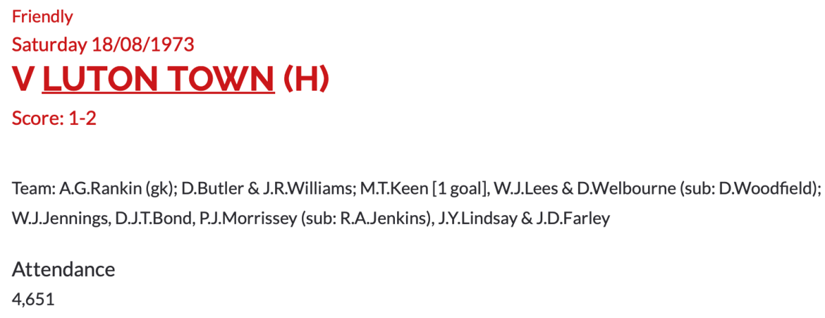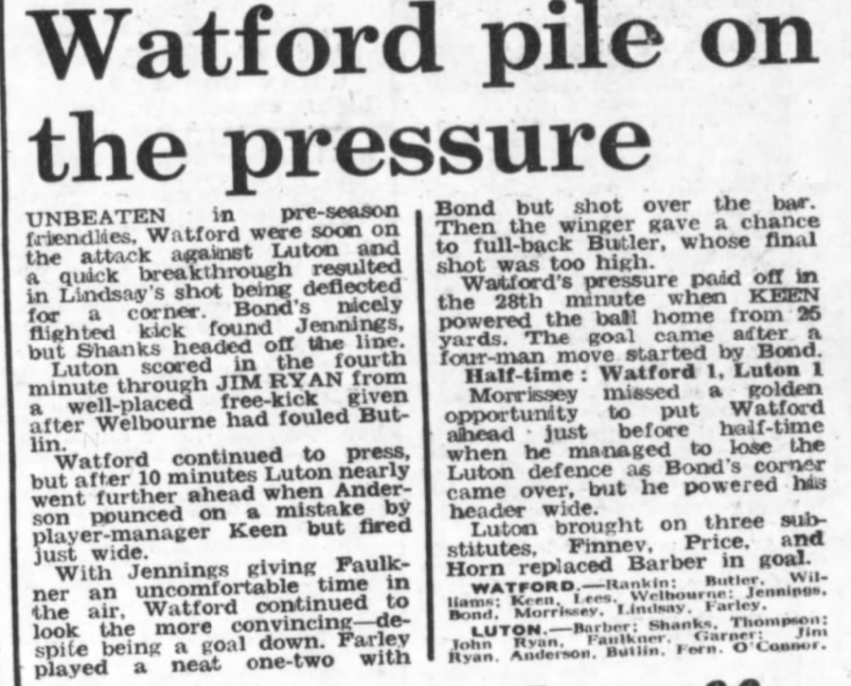 18th August 1973- Friendly, Watford 1 Luton Town 2 https://www.watfordfcarchive.co.uk/fixture/1973-08-18 Evening Standard, 18 Aug 1973 Watford Observer match report Share this: Click to share on X (Opens in new window) X Click to share on Facebook (Opens in new window) Facebook