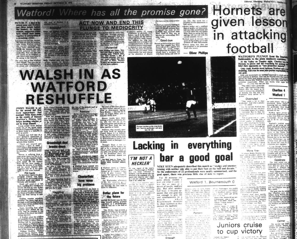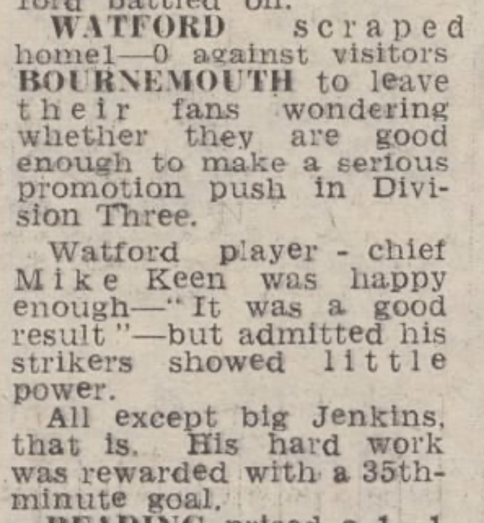 19th October 1974- Division Three, Watford 1 AFC Bournemouth 0 Leave a Reply http://watford.fcdb.info?s=32555&id=3043 Sunday Mirror, 20 Oct 1974 Watford Observer match report Share this: Share on X (Opens in new window) X Share on Facebook (Opens in new window) Facebook