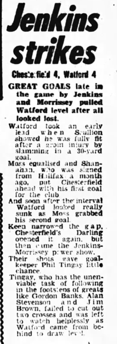 26th October 1974- Division Three, Chesterfield 4 Watford 4 http://watford.fcdb.info/index.php?page=matches Sunday Mirror, 27 Oct 1974 Sunday Mirror, 27 Oct 1974 Watford Observer match report https://www.soccerbase.com/matches/results.sd?date=1974-10-26 https://www.11v11.com/league-tables/league-division-three/26-october-1974/ Share this: Share on X (Opens in new window) X Share on Facebook (Opens in new window) Facebook