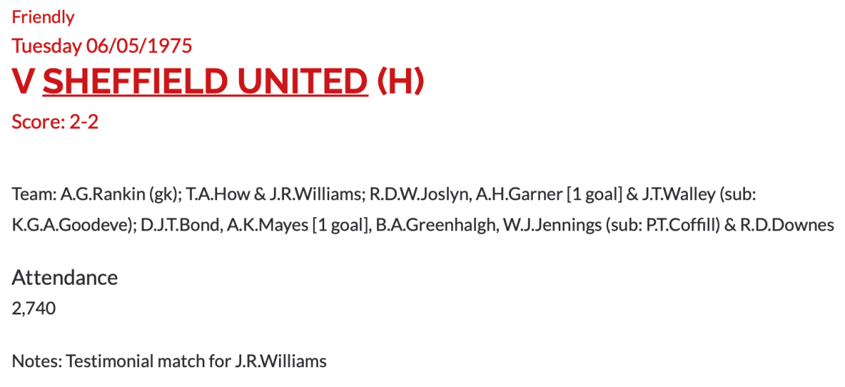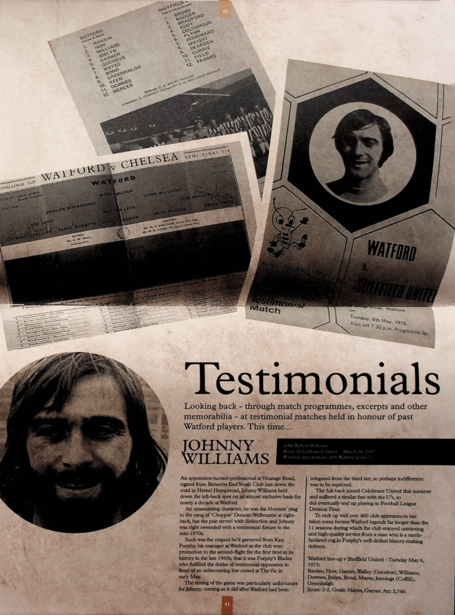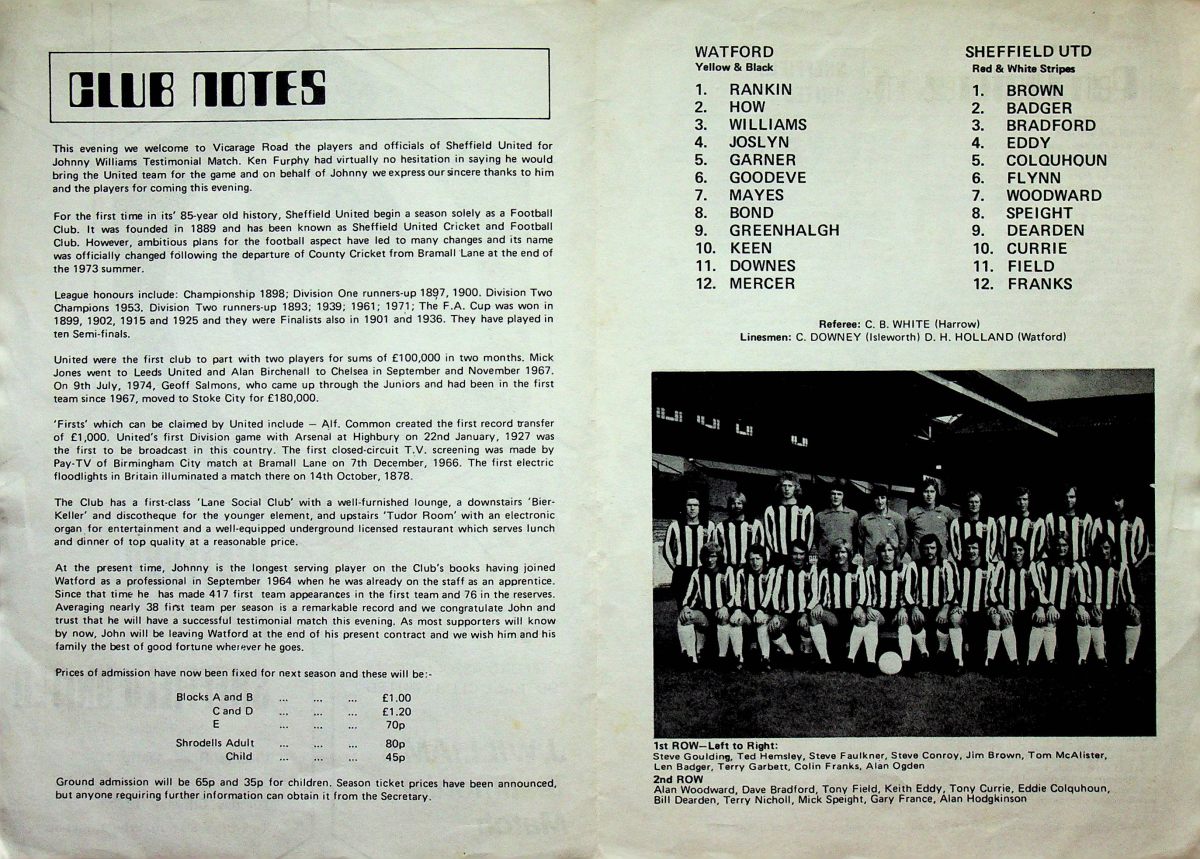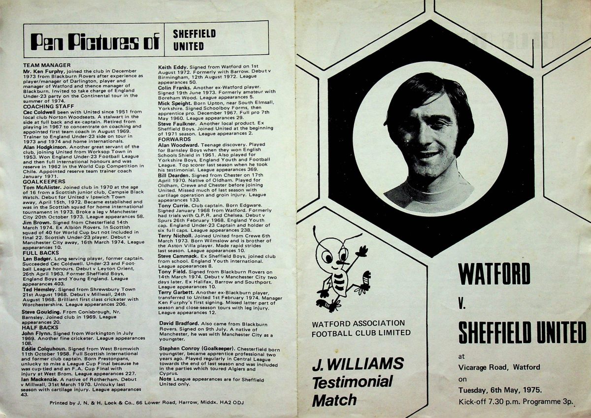6th May 1975- Johnny Williams Testimonial, Watford 2 Sheffield United 2 Programme images courtesy of Matt Hall https://www.watfordfcarchive.co.uk/fixture/1975-05-06 https://oldwatford.com/2019/04/23/23rd-april-2019-premier-league-watford-1-southampton-1/ Share this: Share on X (Opens in new window) X Share on Facebook (Opens in new window) Facebook