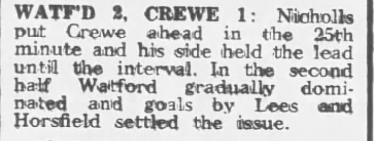 25th October 1975-Division Four, Watford 2 Crewe Alexandra 1 Leave a Reply http://watford.fcdb.info?s=33704&id=3092 Sunday Mirror, 26 Oct 1975 Sunday People, 26 Oct 1975 Sunday Telegraph, 26 Oct 1975 Watford Observer match report Share this: Share on X (Opens in new window) X Share on Facebook (Opens in new window) Facebook
