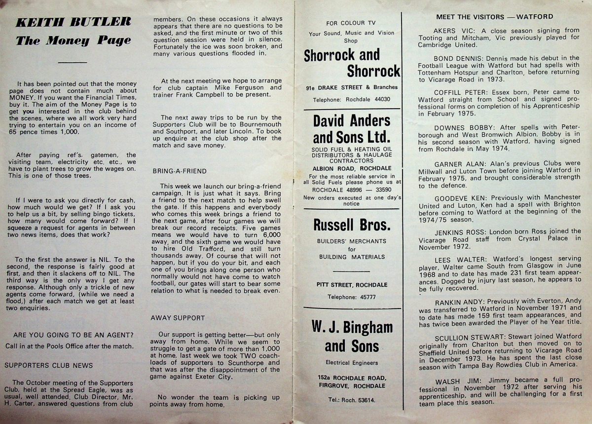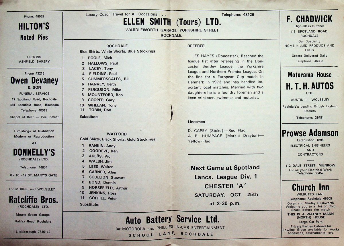 18th October 1975- Division Four, Rochdale 1 Watford 2 Programme images courtesy of Matt Hall https://watford.fcdb.info/index.php?page=matches Sunday Mirror, 19 Oct 1975 Sunday People, 19 Oct 1975 Watford Observer match report Sunday Telegraph, 19 Oct 1975 Share this: Share on X (Opens in new window) X Share on Facebook (Opens in new window) Facebook
