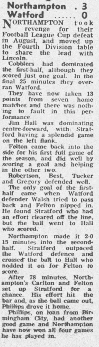 1st November 1975- Division Four, Northampton Town 3 Watford 0 https://watford.fcdb.info/index.php?page=matches Sunday Mercury, 2 Nov 1975 Sunday Mirror, 2 Nov 1975 Sunday People, 2 Nov 1975 Sunday Telegraph, 2 Nov 1975 Share this: Share on X (Opens in new window) X Share on Facebook (Opens in new window) Facebook