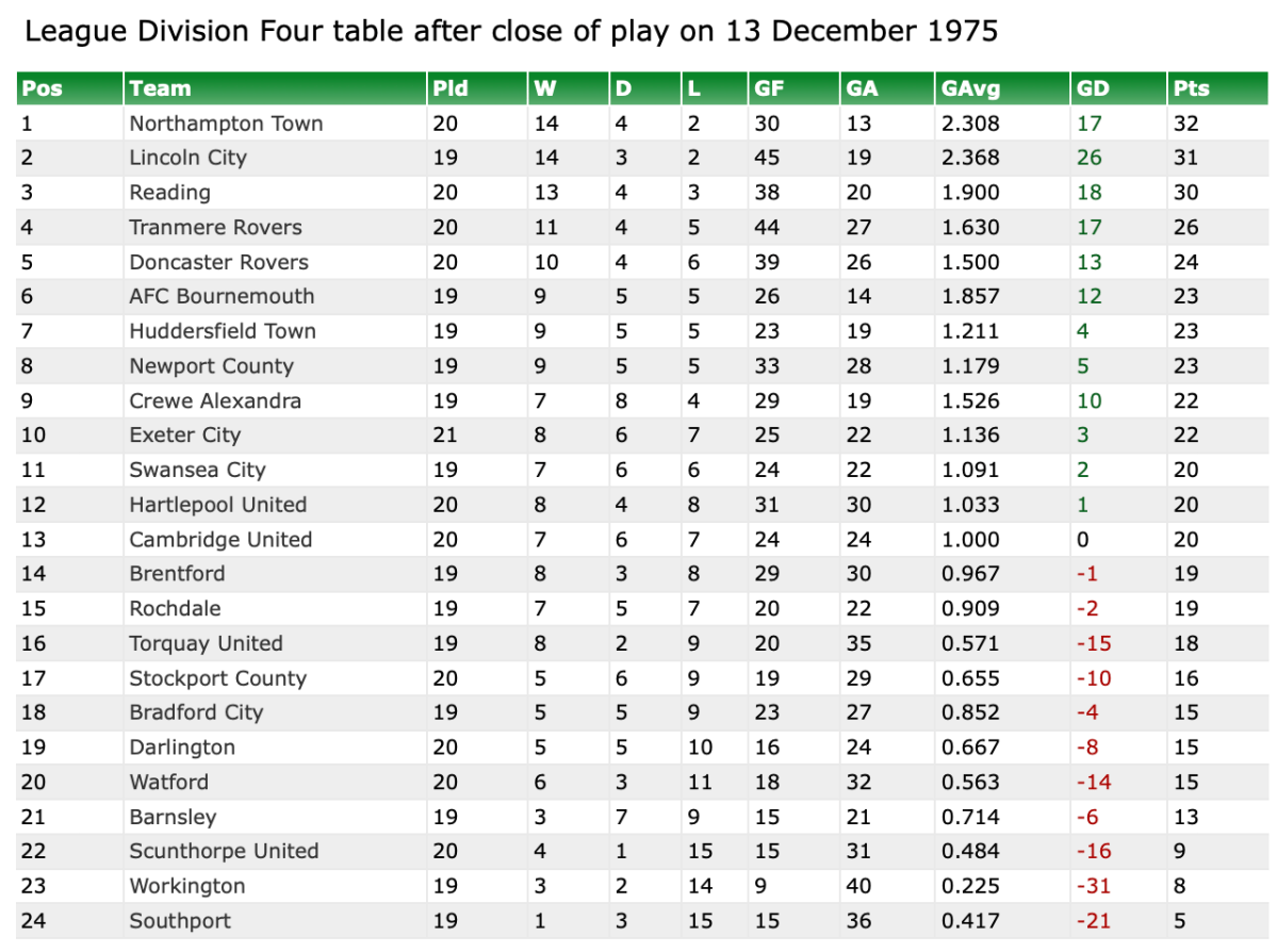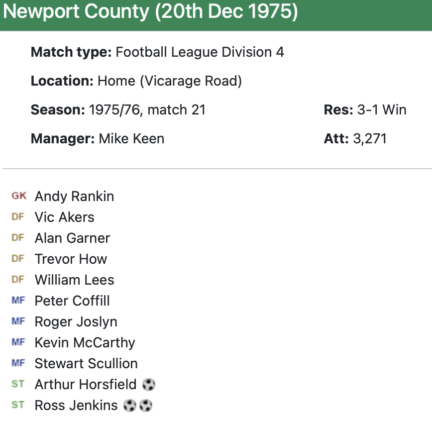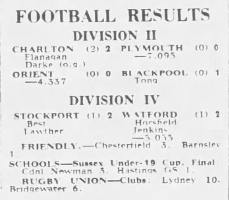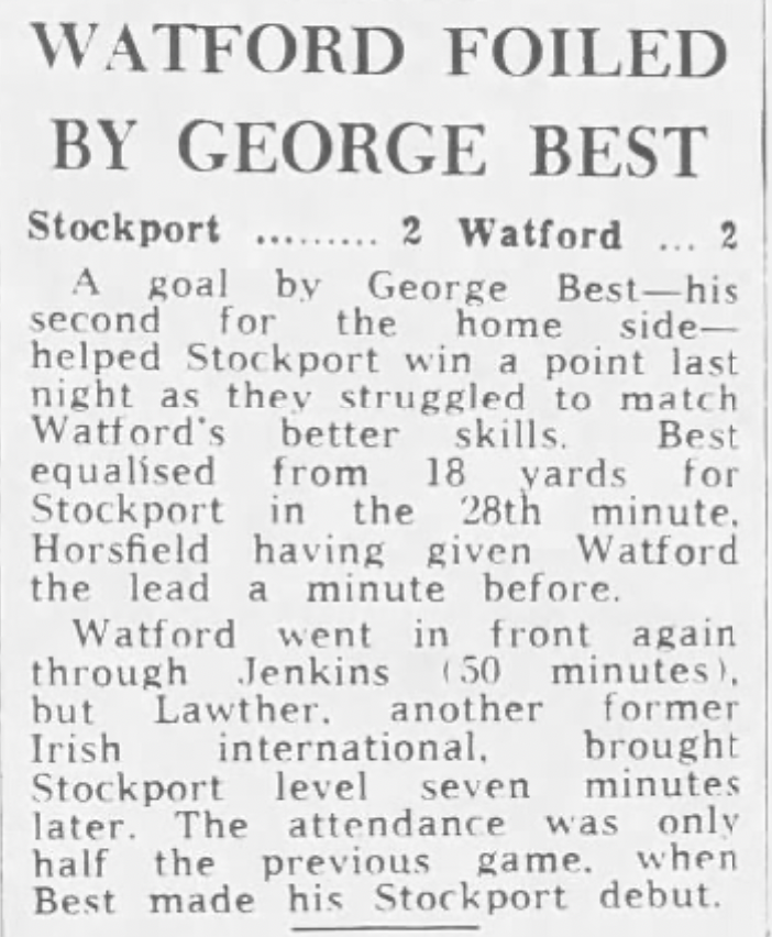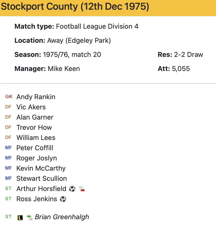 12th December 1975- Division Four, Stockport County 2 Watford 2 https://watford.fcdb.info/index.php?page=matches Daily Telegraph, 13 Dec 1975 Watford Observer match report https://www.11v11.com/league-tables/league-division-four/13-december-1975/ Share this: Share on X (Opens in new window) X Share on Facebook (Opens in new window) Facebook